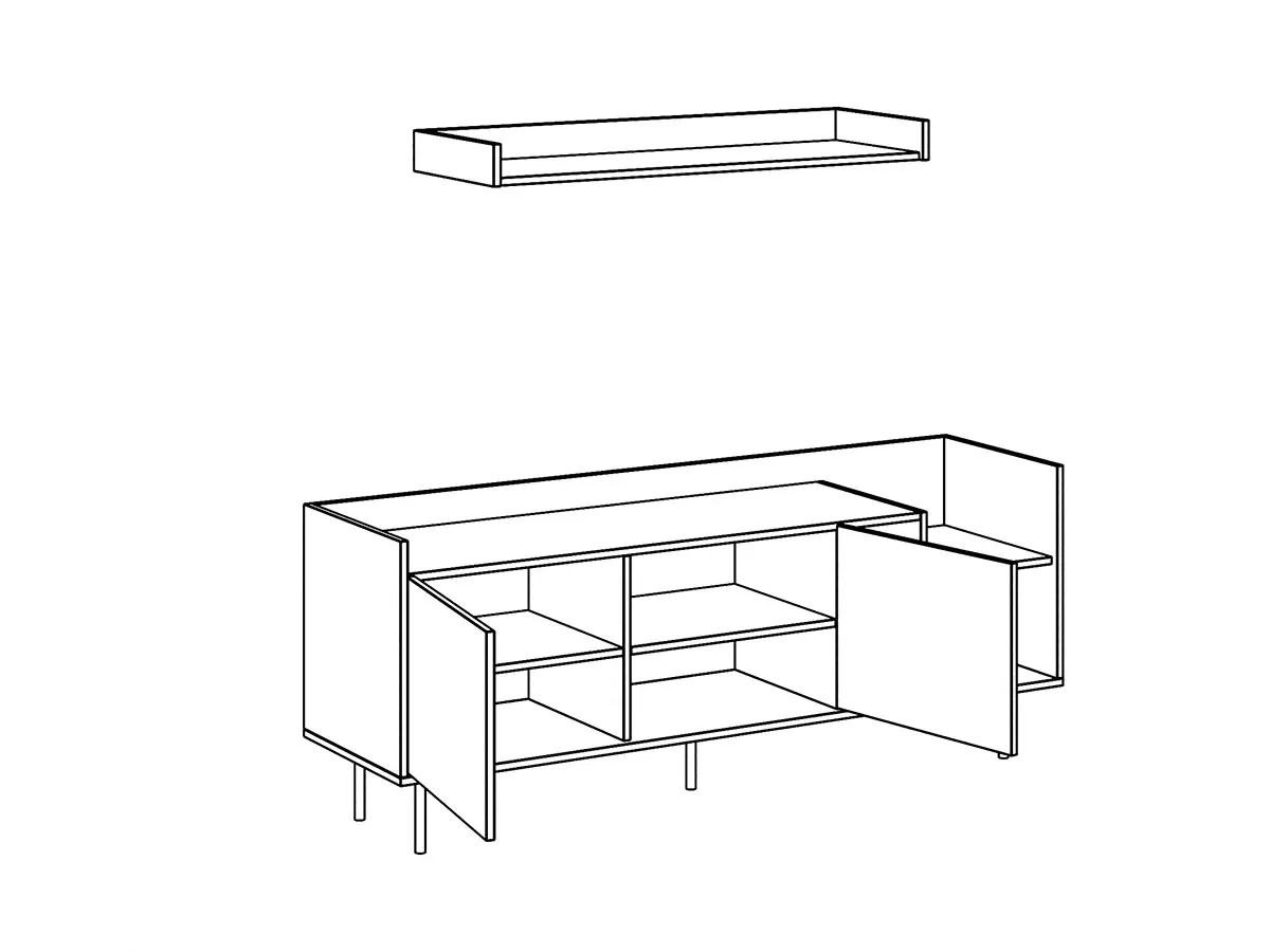 Фасад включает в себя все детали в декоре Робиния Бренсон – верхний щит, двери, открытая перегородка и полка. Отделение за дверями разделено вертикальной перегородкой, в каждом отделении по одной съёмной полке. Система открывания дверей - Push-to-Open («нажал-открыл»). Соединительная фурнитура – Hettich. Материалы корпуса и фасада – ЛДСтП толщиной 16 мм. Опоры – металлические, окрашенные черной эмалью, высотой 160 мм, диаметром 20 мм, с пластиковыми подпятниками. Тумбу рекомендуется крепить к стене для защиты от опрокидывания (крепежи входят в комплект).