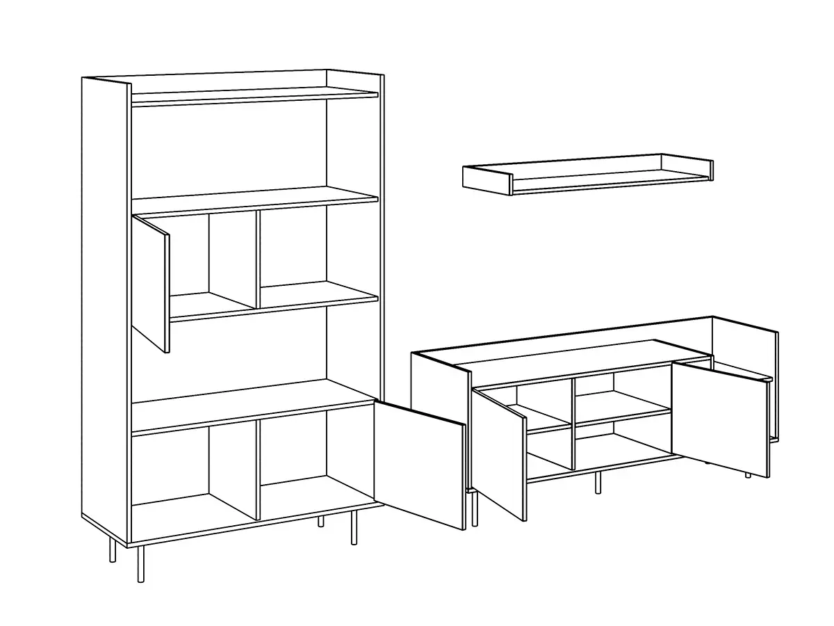 Нижнее и третье снизу отделения разделены вертикальными перегородками. В нижнем отделении дверь закрывает правую сторону, в третьем отделении – левую сторону. Материалы ЛДСтП толщиной 16 мм. Опоры – металлические, окрашенные черной эмалью, высотой 160 мм, диаметром 20 мм, с пластиковыми подпятниками. Система открывания дверей - Push-to-Open («нажал-открыл»). Соединительная фурнитура – Hettich. Стеллаж рекомендуется крепить к стене для защиты от опрокидывания (крепежи входят в комплект).