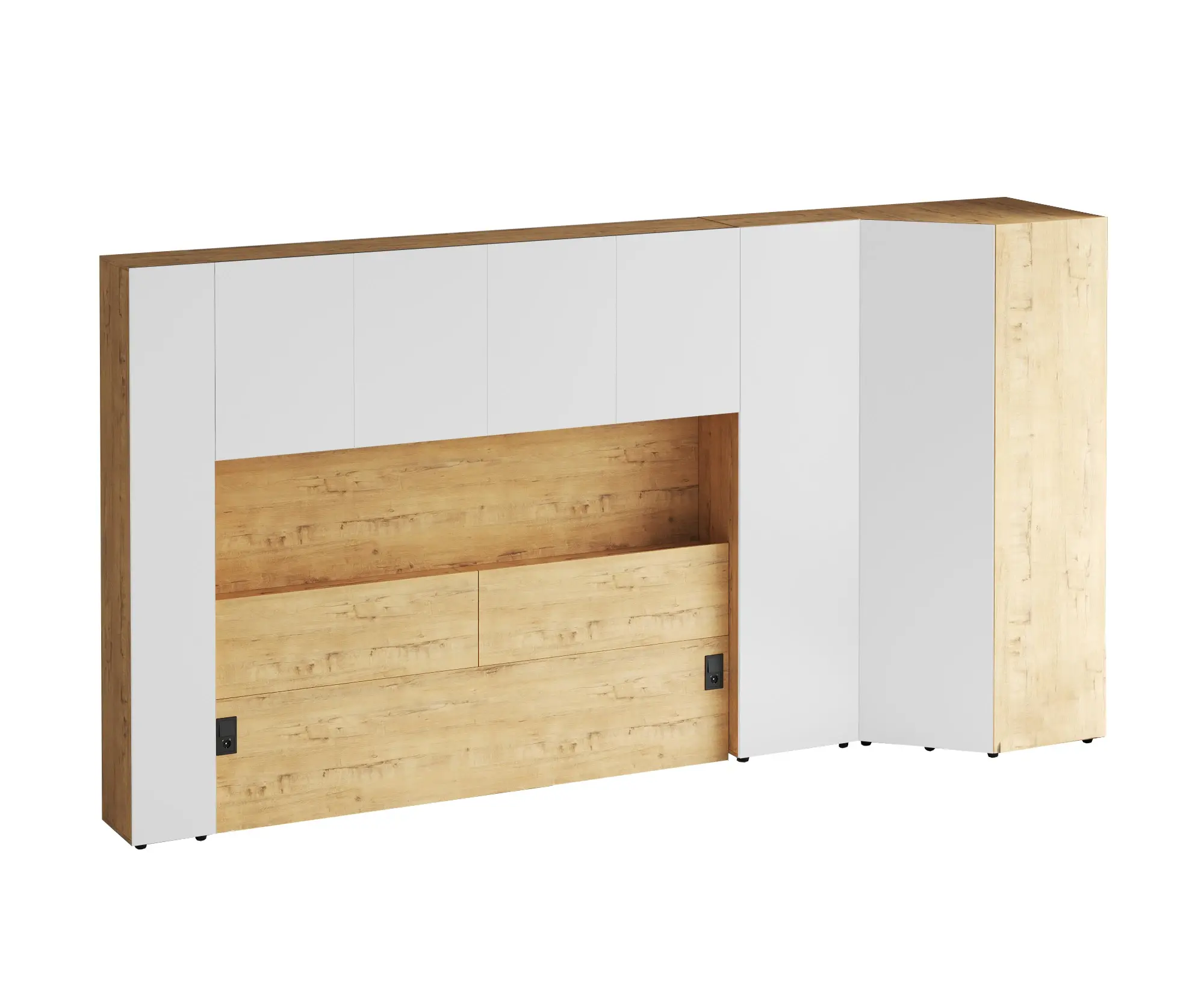 Кроватный блок предназначен для использования совместно с кроватью или диваном. Блок имеет два отделения за откидными дверьми и открытую полку над ними. Двери открываются за кромку, с помощью газовых кронштейнов. Кроватный блок оснащен светодиодным светильником, расположенным на открытой верхней полке. Светильник представляет собой алюминиевый профиль с матовым экраном, внутри которого установлена светодиодная лента. С левой и с правой стороны переднего щита блока установлены выключатели светильника и эл. розетки с разъемами USB А и Type C. Блок установлен на регулируемые опоры.