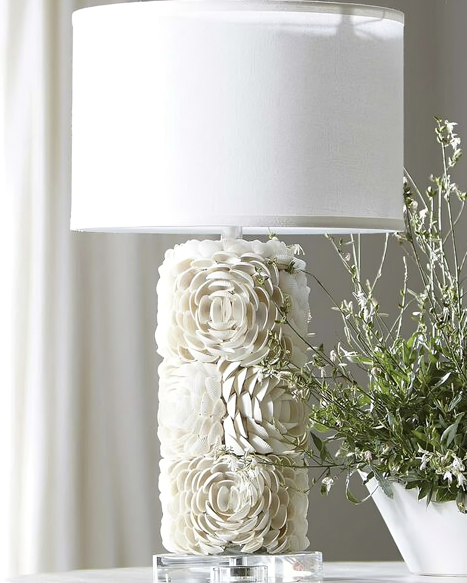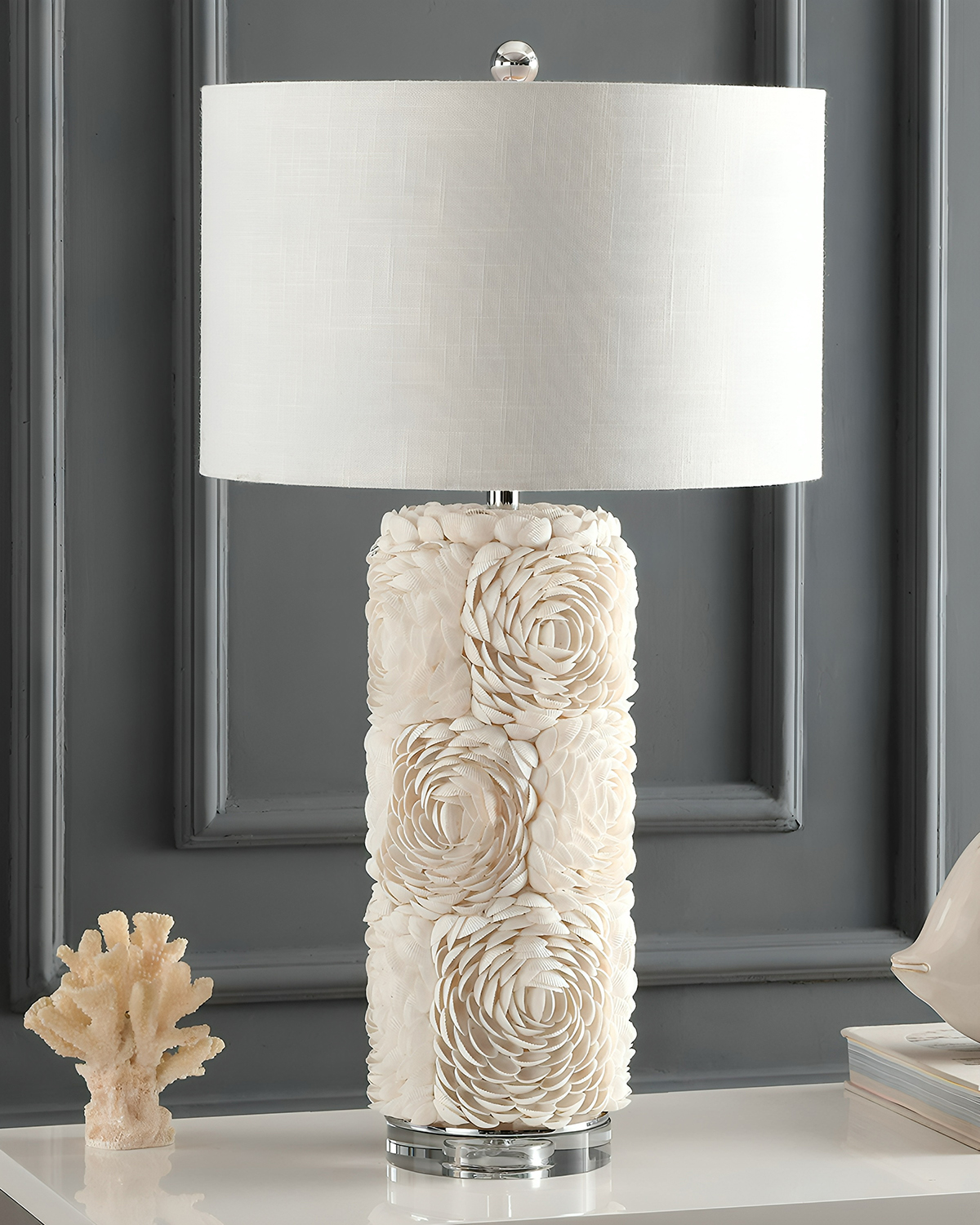 Настольная лампа “Аугуста” отличается необычным дизайном в прибрежном стиле, украшенном узорами в виде больших открытых цветов, выполненными в мозаике из натуральных ракушек. Эта лампа будет привлекать внимание и добавлять уникальности любому помещению. Особенностью этой лампы является ее романтический стиль, которые придают ей неповторимый вид. Абажур из белого текстурированного хлопка обеспечивает мягкое и рассеянное освещение, создавая уютную атмосферу в комнате. Благодаря своим размерам, эта настольная лампа отлично подходит для использования на столе, комоде или прикроватной тумбочке. Кроме своей эстетической привлекательности, настольная лампа “Аугуста” также функциональна. Ее акриловая подставка обеспечивают стабильность и надежную поддержку. Эта лампа идеально сочетается с различными стилями интерьера, от классического и рустик до современного и скандинавского. Она прекрасно дополнит вашу гостиную, спальню, кабинет или любое другое помещение, придавая ему особый шарм. Завораживающий дизайн делает эту лампу привлекательным выбором для тех, кто ценит прекрасное и со вкусом. Если вы ищете необычную и стильную настольную лампу, которая одновременно будет служить источником света и стильным аксессуаром, то настольная лампа “Аугуста” – идеальный выбор!