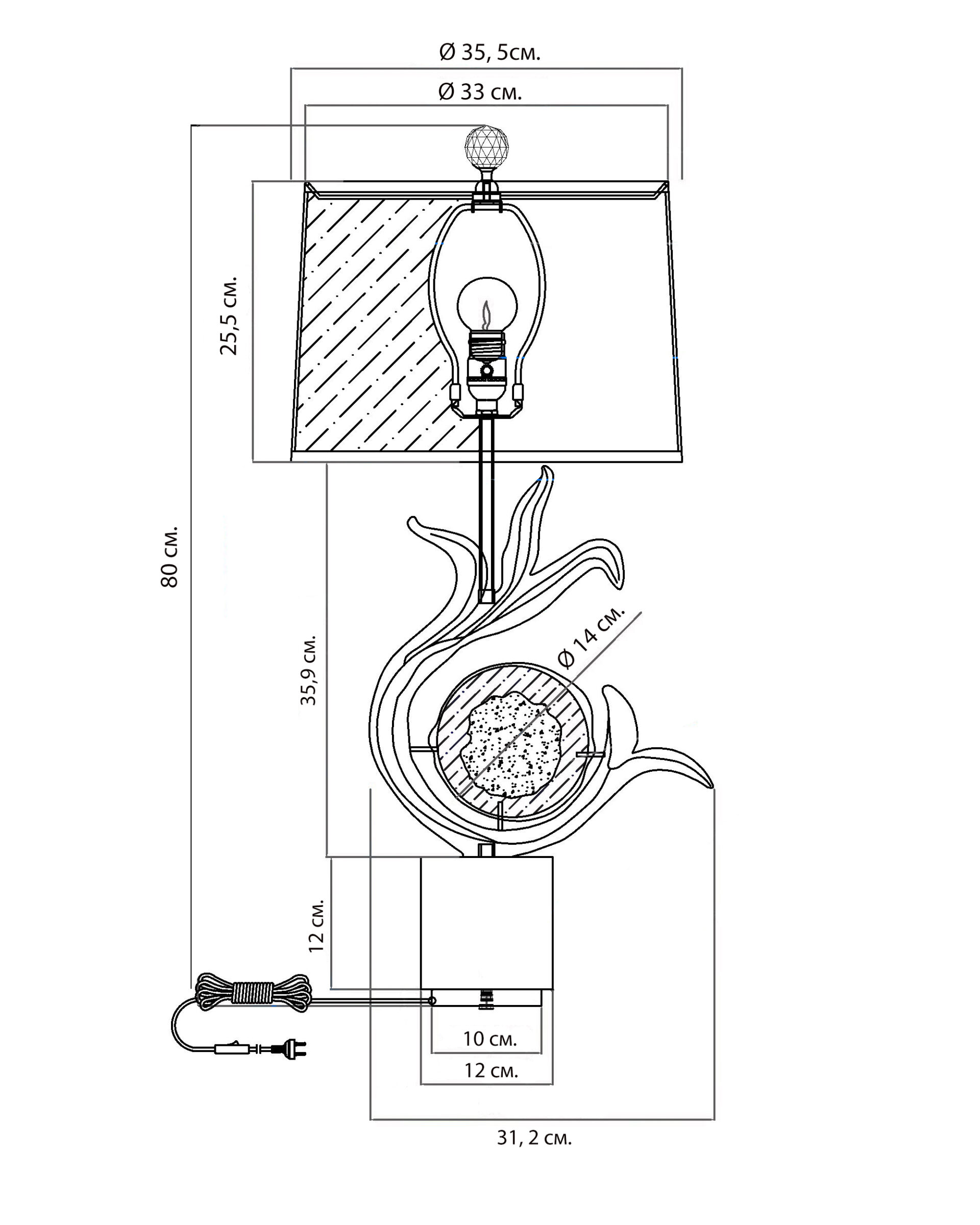 Тип цоколя: Е27. Напряжение: 220 Вольт. Длина провода 1,4 м.Тип розетки: евро.Настольная лампа “Эдеса” – это золотое основание лампы, которое декорировано синим агатом переходящий в естественный белый цвет. Белый абажур добавляет элегантности, создавая потрясающую настольную лампу для современного интерьера в вашем доме. Настольную лампу дополняет белый абажур, он создаёт мягкое и приятное освещение в комнате. Абажур отлично сглаживает свет, сделает его приятным для глаз и создаст уютную атмосферу вокруг лампы. Эта комбинация делает основание лампы необычным и привлекательным. Настольная лампа “Эдеса” идеально подходит для современного интерьера и дополняя его. Она станет прекрасным дополнением к вашей консоли или прикроватным столикам, придавая помещению изысканность и изящество!
