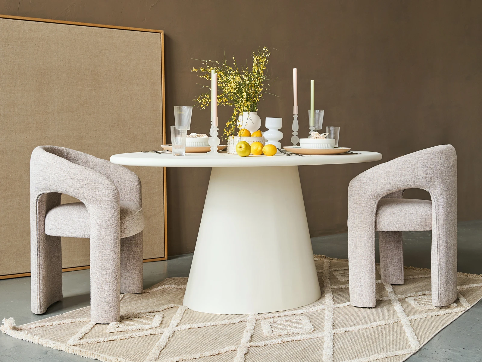 Обеденный стол Gabi — это воплощение современного минимализма с характером. Овальная столешница из белого микроцемента с плавными динамичными формами визуально облегчает конструкцию, создавая эффект парящей поверхности. Сочетание элегантного дизайна, уникальной фактуры и исключительной практичности делает этот стол стильным центром притяжения для любой столовой или кухни-гостиной.