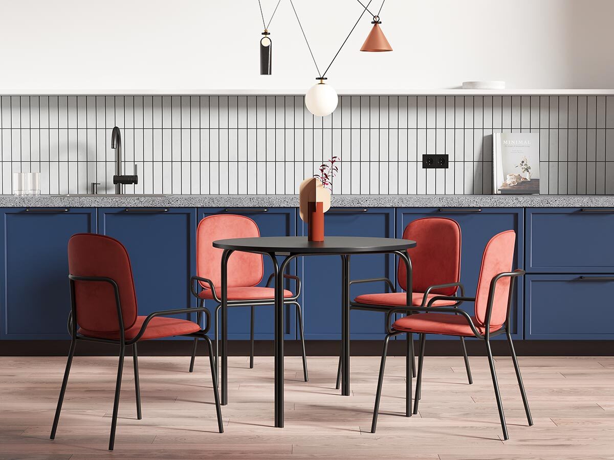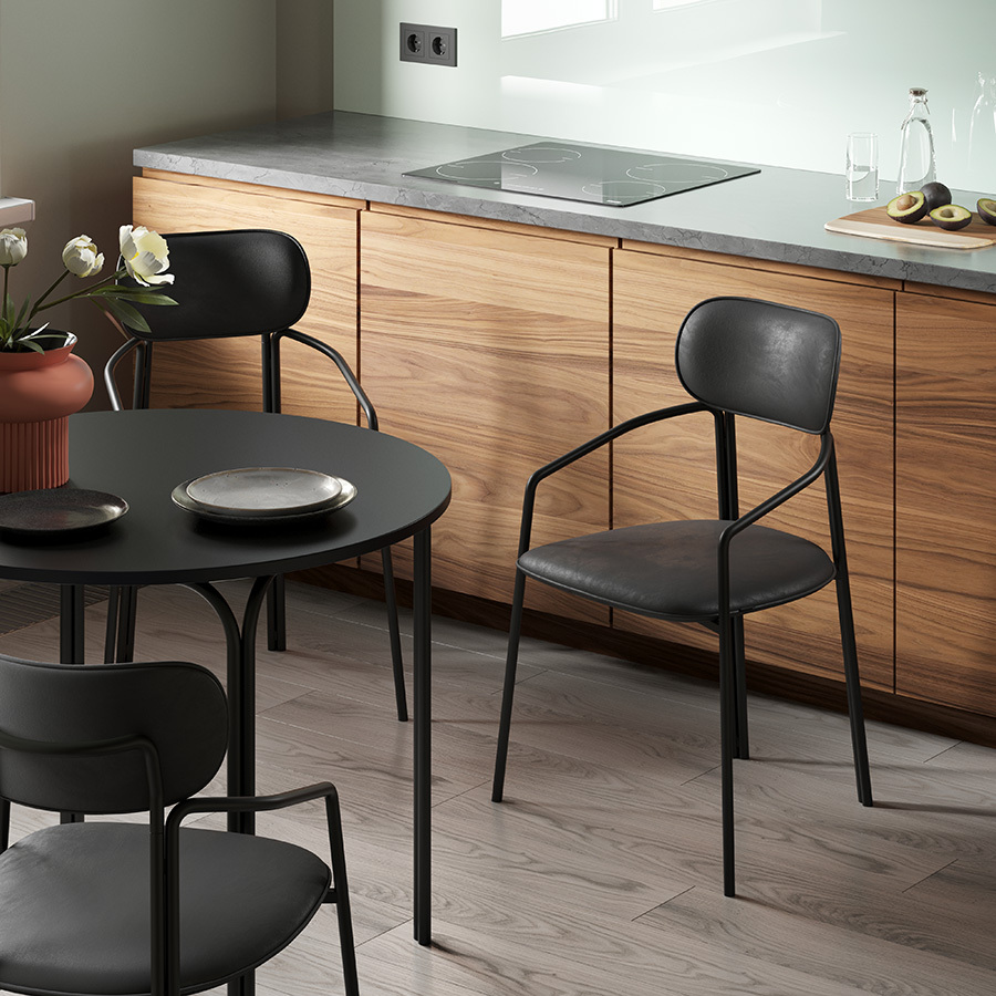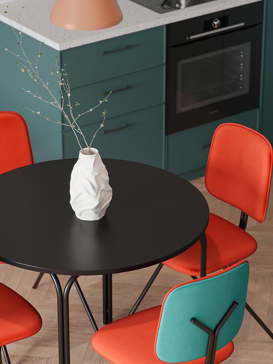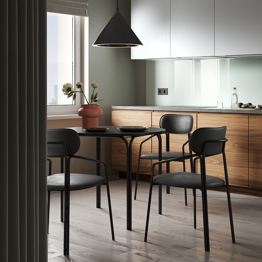 Коллекция Ror – это мебель с индивидуальным характером. Отправной точкой создания линейки стало динамичное движение, воплощенное в логотипе Олимпиады 80, где беговые дорожки образуют силуэт Спасской башни. Стол обеденный имеет прочный стальной каркас с порошковым покрытием, что делает его надежным и долговечным. Столешница из ламинированной МДФ отличается повышенной устойчивостью к царапинам, легко моется и не впитывает грязь. Прекрасные эксплуатационные характеристики позволяют использовать мебель не только в домашних условиях, но и для обустройства коммерческих пространств. Все материалы отвечают высоким стандартам практичности и экологической безопасности. Модель с круглой столешницей дает возможность экономить полезную площадь и при необходимости разместить большее количество стульев. Стол с простым, но в то же время элегантным дизайном украсит интерьер кафе, ресторана, отлично подойдет для оформления обеденной зоны в доме или квартире. Материалы: сталь, ламинированная МДФ. Диаметр: 90 см. Цвет: черный. Пыль и загрязнения с поверхностей можно удалять при помощи мягкого влажного материала. После очищения мебель рекомендуется протереть сухой салфеткой.