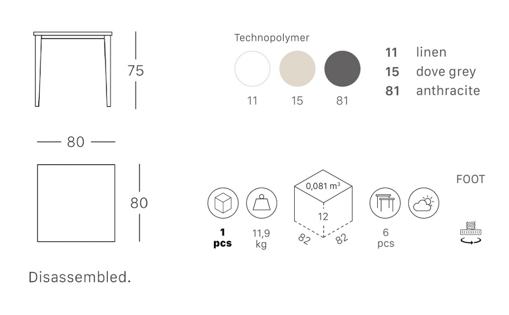 Дизайн: Centro Stile S•CAB. Timo -это уличный стол на четырехалюминиевых ножках с гладкойстолешницей из полипропилена. Стол идеально сочетается со всеми пластиковыми стульями Scab Design. Чрезвычайно универсальный, он отвечает потребностям любого типа окружающей среды, потому что, помимо обеспечения максимальной стабильности, он очень практичен в использовании и может быть легко штабелирован. Timo подходит для домашнего и контрактного применения, внутри и снаружи помещений, придавая нотку свежести и динамизма контекстам с современным видом. Особенности: Ножки выполнены из алюминия с порошковым покрытием. Столешница выполнена из полипропилена. Возможность штабелирования до 6шт. Регулируемые поворотные ножки. Данная модель предназначена для использования на летних верандах, террасах, фудкортах, а такжево внутреннем интерьере кафе, ресторанов. Варианты цветаможно выбрать из палитры. Поставляется в разобранном виде. Посмотреть технические характеристики. Для уточнения всех возможных вариантов материала ицвета данного изделия обращайтесь к нашимменеджерам!