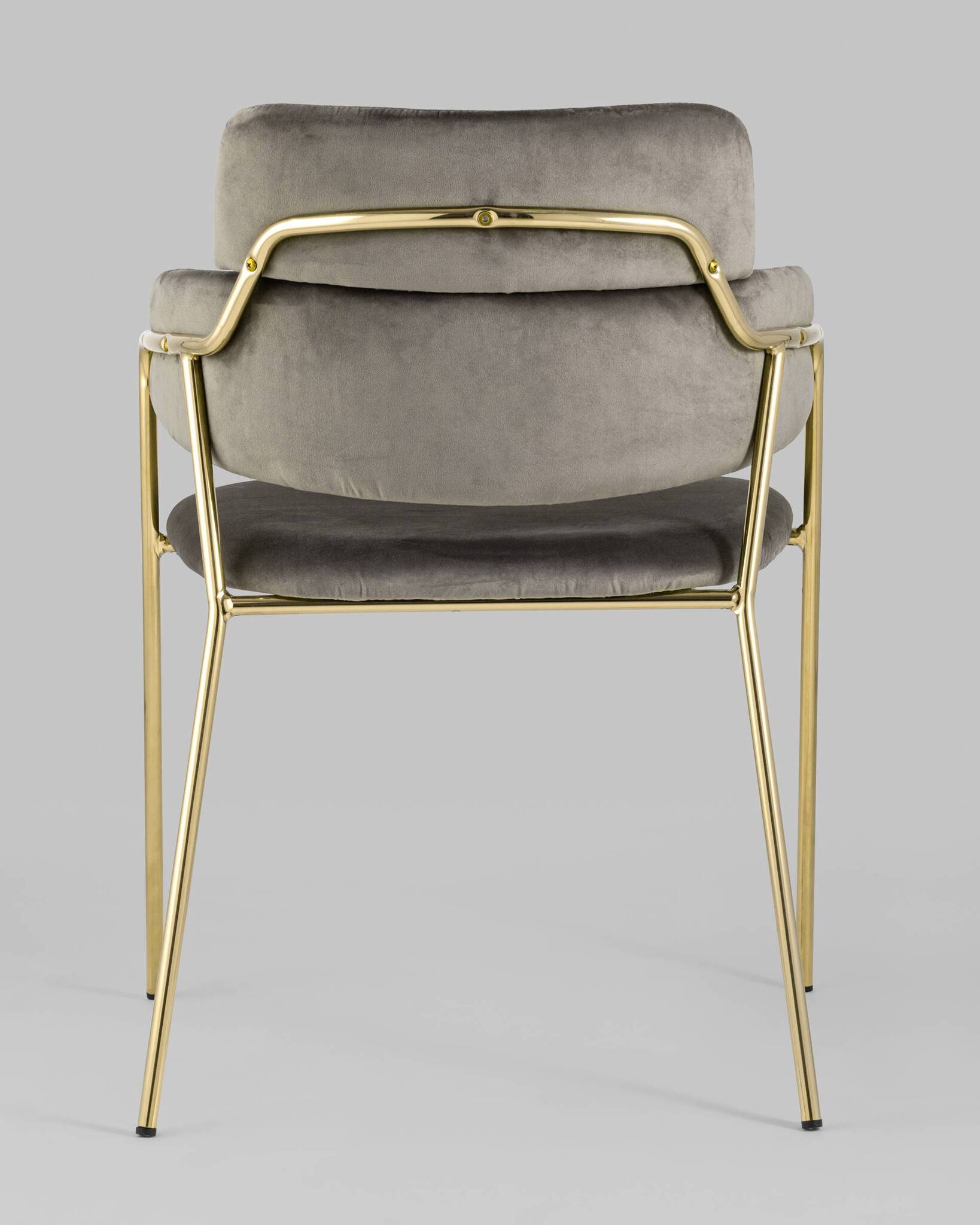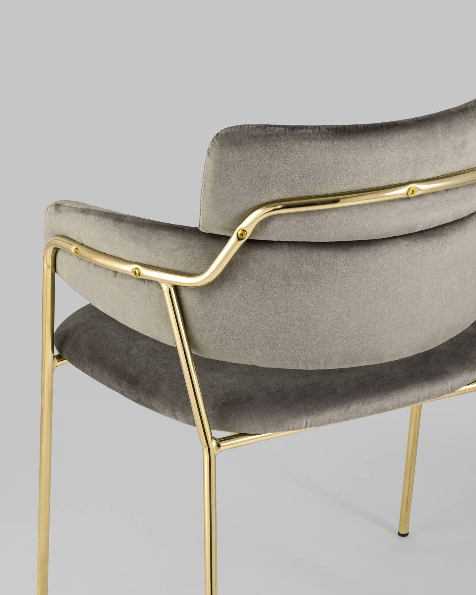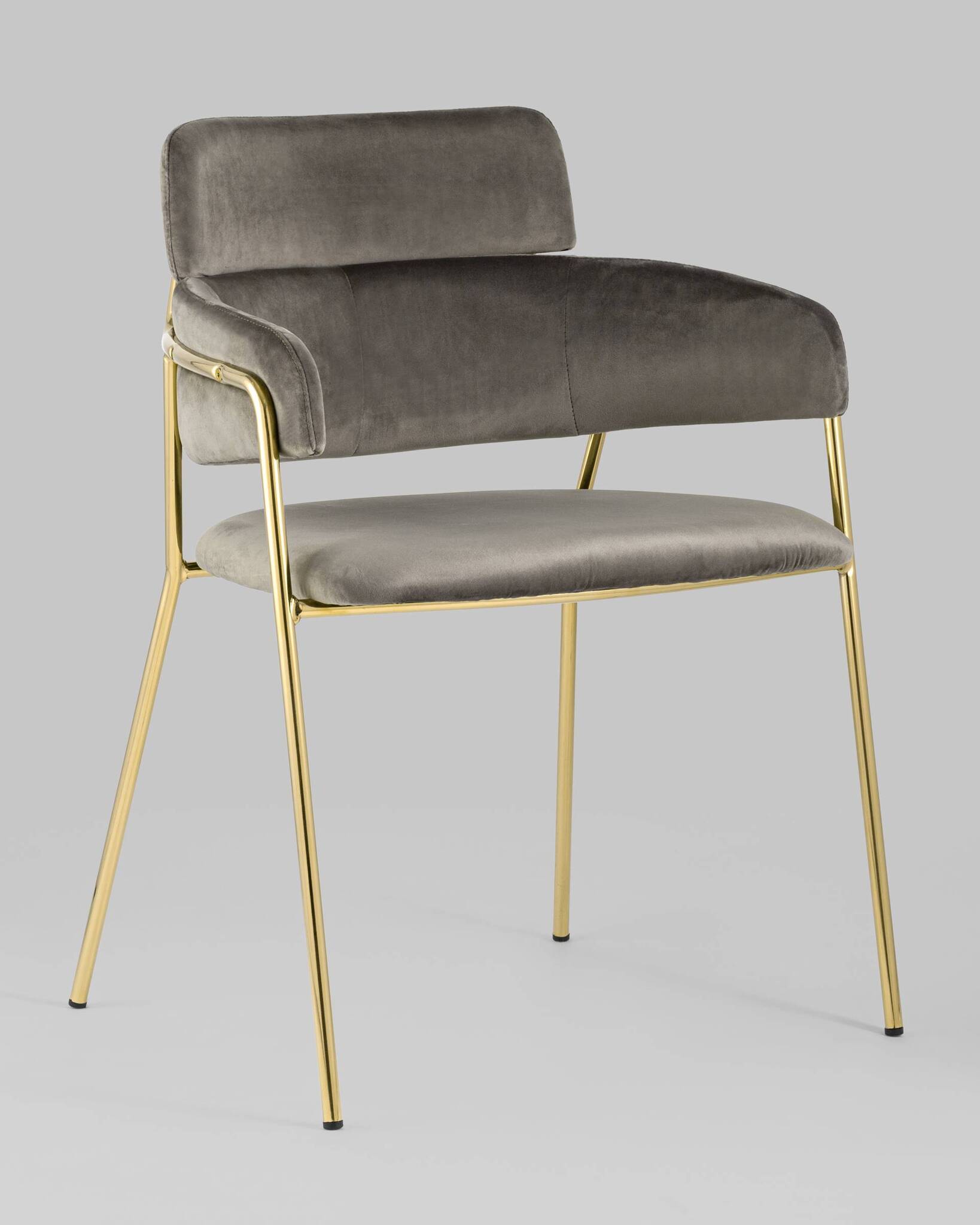 Стильный стул с оригинальной формой спинки, высокой поддержкой и подлокотниками. В качестве обивки используется мягкий велюр. Металлический каркас золотого цвета огибает спинку и выступает аккуратным акцентом модели. Широкое сиденье обеспечивает удобную посадку и уют.