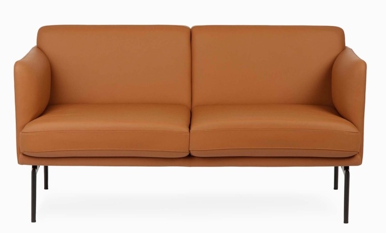 Двухместный диван Bisq. Каркас из массива дерева, обивка из кожи. Ножки стальные, чёрные. Высота сиденья 45 см, глубина 89 см.