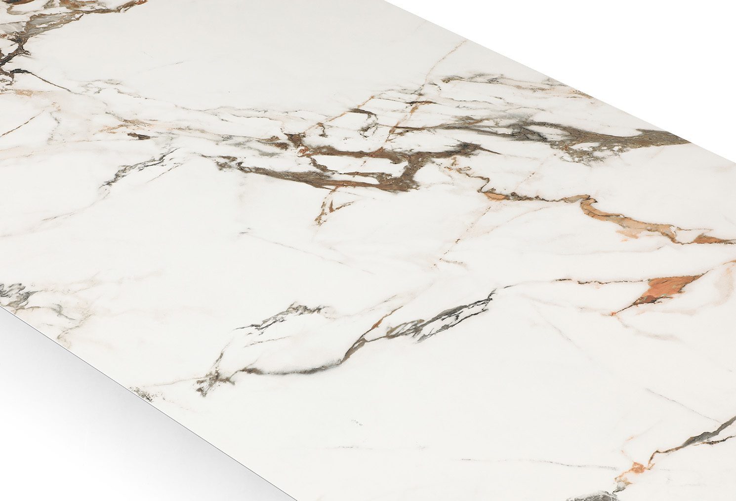 Раскладной стол Roma 200-300 — это гимн итальянскому наследию, переосмысленному через призму высоких технологий. Его столешница, выполненная из высокопрочной керамики толщиной 3 мм на жёстком основании из калёного стекла 8 мм, с точностью повторяет рисунок итальянского мрамора. Технология позволяет воспроизвести не только цвет, но и глубинную, трёхмерную текстуру натурального камня, предлагая его безупречную эстетику без присущих мрамору недостатков: хрупкости, пористости и необходимости сложного ухода.