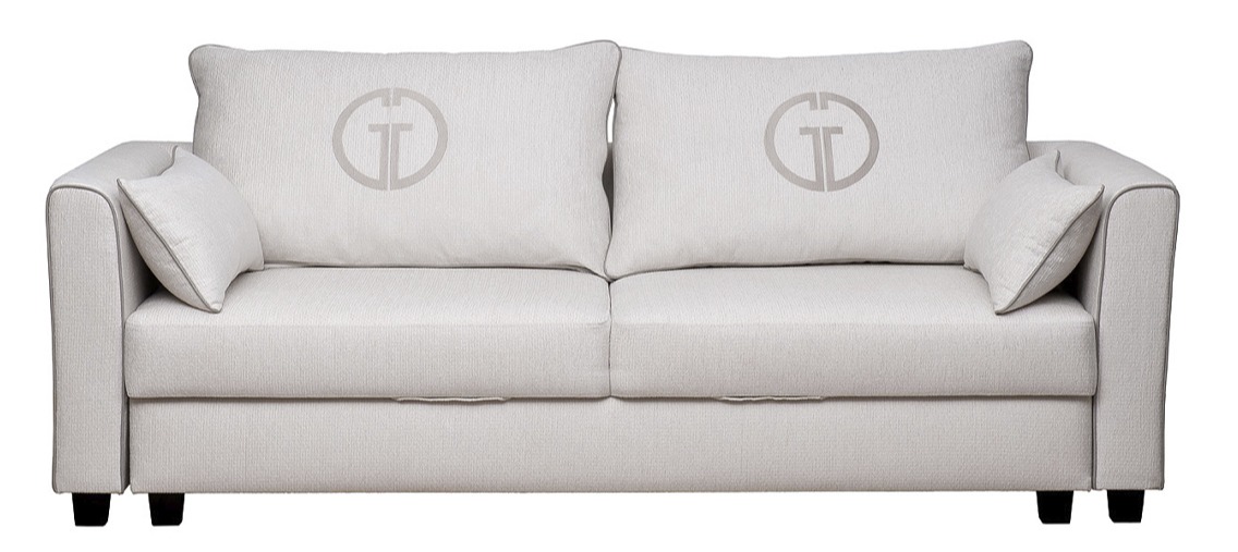 Раскладной трехместный диван Marco. Механизм трансформации — «Пума». Каркас из натуральной древесины. Обивка из рогожки Koza2601-ECRU (светло-серый), кант — искусственная кожа Nevada 21. Ножки цвет №4. Спальное место — 153×191 см. В комплекте: 2 подушки спинки с эмблемой GD (в цвет канта) + 2 декоративные прямоугольные подушки у локтей.