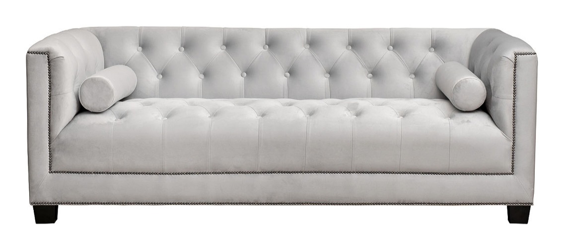 Эффектный диван Sanremo с каретной стяжкой. Стиль ар-деко, элегантная роскошь. Обивка из велюра Colton030 SVSER (светло-серый). Каркас и ножки деревянные. Гвоздевая лента — состаренная бронза. В комплекте 2 валика в основной ткани. Наполнитель — пенополиуретан и периотек.