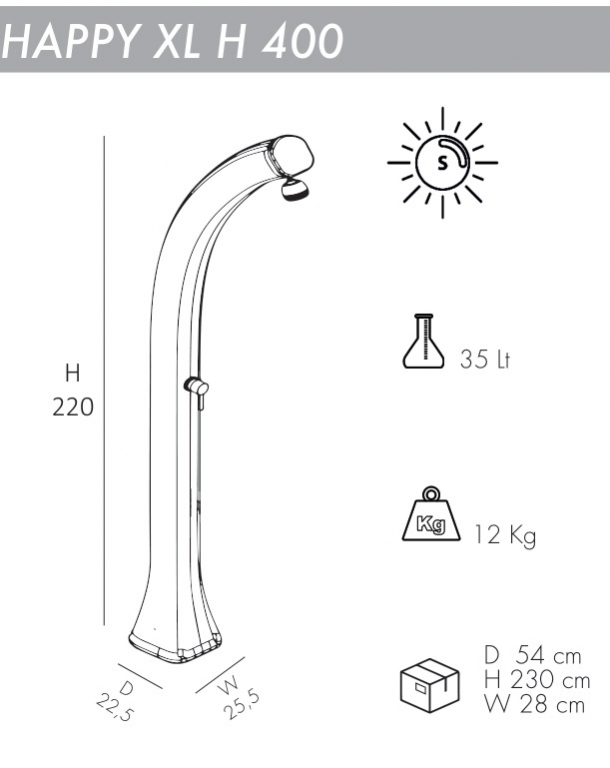 Дизайн летнегодуша Happy XL H400с нагревом воды от солнца сочетает в себе простоту и минималистичность. Солнечный душ Happy XL H400 подходитдля установки на открытом воздухе в гостиницах, кемпингах, туристическихили пляжныхкурортах,илидля частного использования. Особенности: колонна выполнена изполиэтилена высокой плотности (ПНД), который обладает устойчивостью к ультрафиолетовым лучам, коррозии, соли и известняку; встроенный предохранительный клапан; смеситель горячей воды из бака и холодной воды из источника. Материал - нержавеющая сталь; душевая насадка; емкость для воды на 35л; нагрев воды от солнечных лучей; винты для крепления в комплекте; устойчивость к УФ, соли и накипи; возможность крепления к песку или газону с помощью винта D125 и меламиновой плиты D180 (приобретаются отдельно); размер входящей трубы для подключения воды 1,27 см; широкая палитра цветов. Скачать инструкцию по установке. Скачать техническую карту. Принцип работы максимально прост, что делает солнечный душ популярным атрибутом пляжныхкурортов. Вода, хранящаяся в корпусе душа, нагревается за счет солнца. Нагретая вода смешивается с холодной водой из источника постоянного водоснабжения (или из садового шланга). При помощи смесителя возможна регулировка потокагорячей и холодной воды до температуры комфорта.
