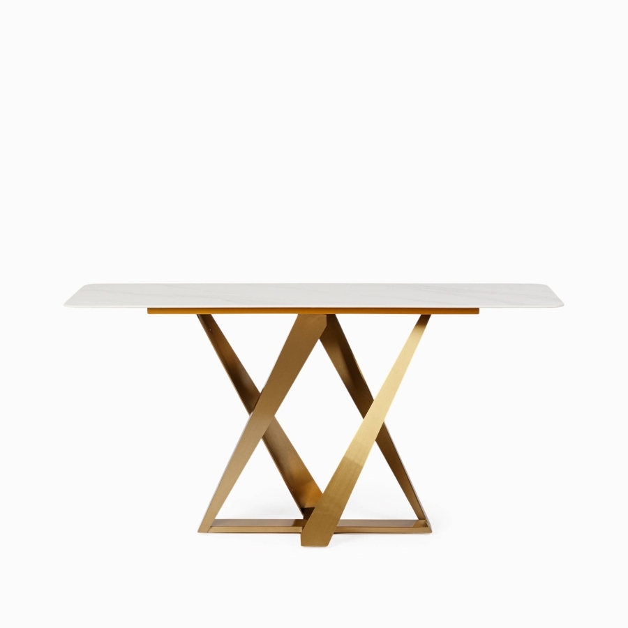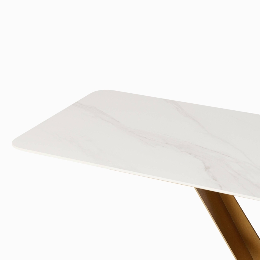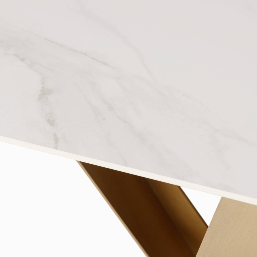 Гладкие поверхности белого искусственного камня с эффектом мрамора и изысканный золотой металл создают потрясающий контраст, подчеркивая изящность и утонченность. Легкие геометрические формы и тонкие металлические ножки придают модели визуальную легкость, делая её настоящим акцентом в интерьере.