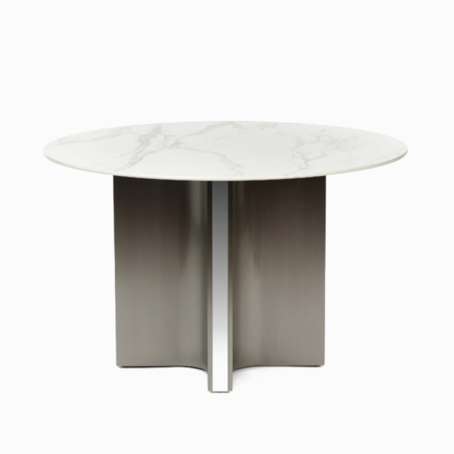 Современная чистота линий и лёгкость: Комбинация тонкой керамической «тарелки» и часто минималистичной стальной ножки (вероятно, центральной опоры) создаёт визуально лёгкую, воздушную композицию. Такой стол не перегружает пространство, а органично дополняет его.