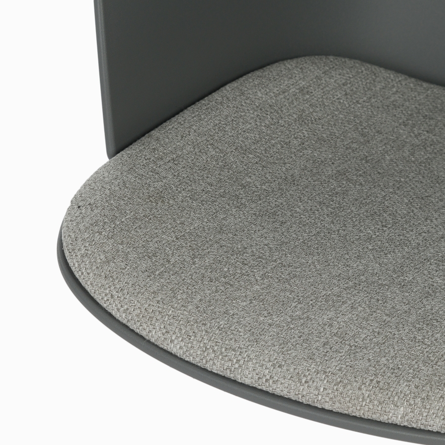 Стул имеет мягкое сиденье с обивкой из серой ткани и металлические ножки с черным покрытием.