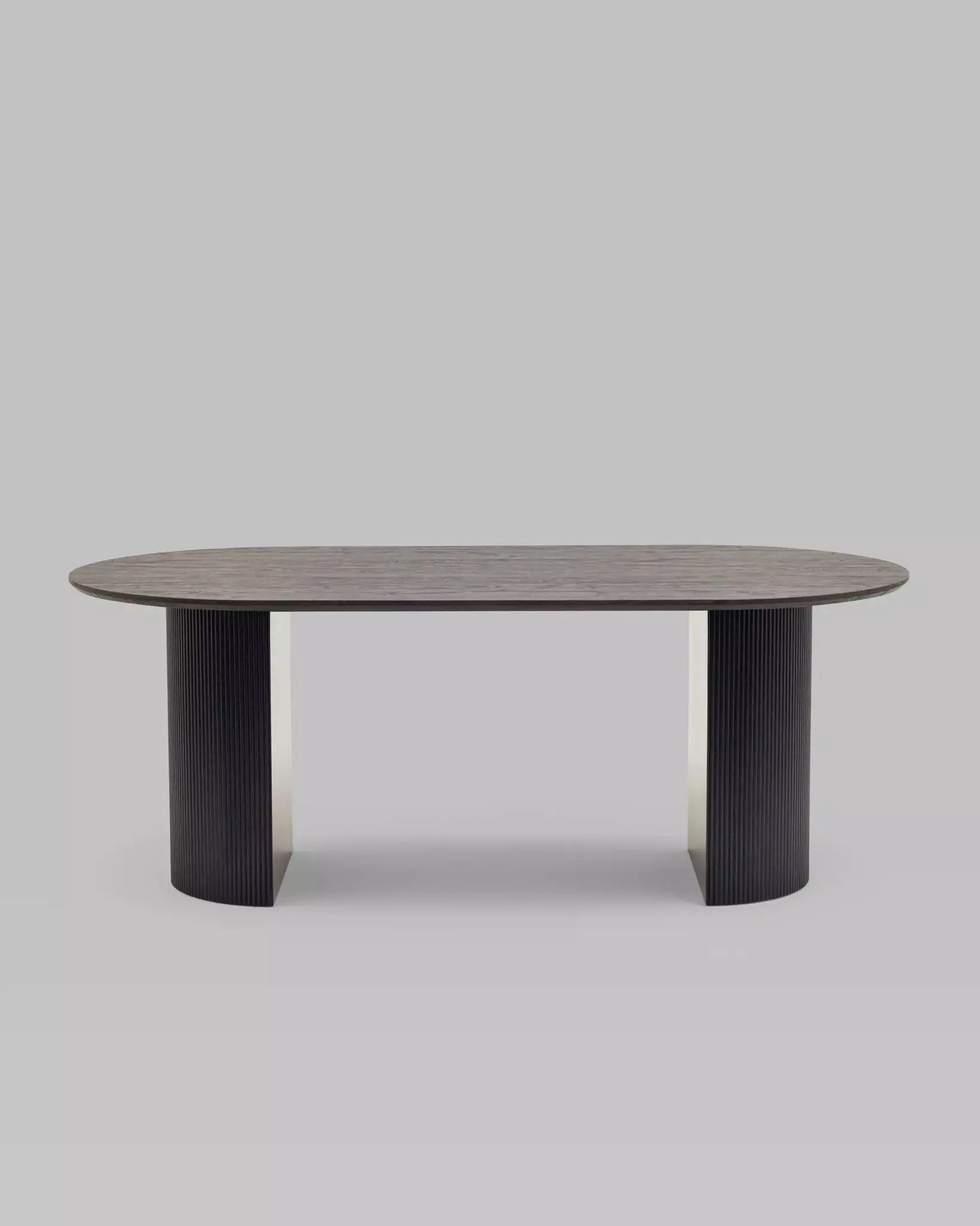 Столешница выполнена из прочного и долговечного МДФ. Темная поверхность столешницы гармонично сочетается с массивными ножками черного цвета. Простая овальная форма стола позволит легко вписать его в современный интерьер, стол украсит кухню, гостиную или современное кафе, ресторан. Опорные плиссированные ножки в лаконичном дизайне надёжно удерживают всю конструкцию и дополняют монолитный образ.