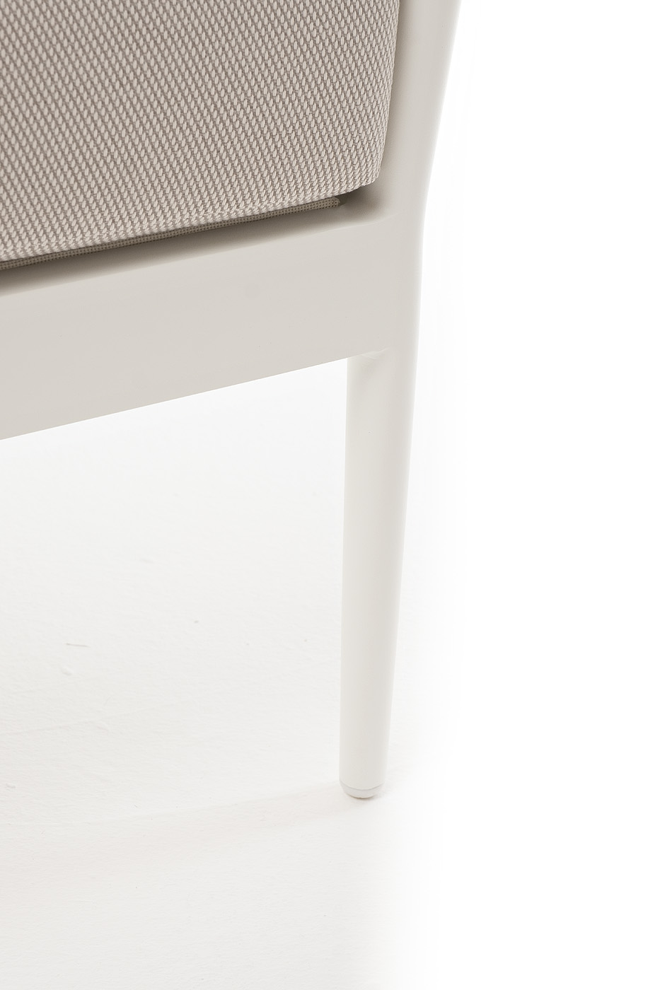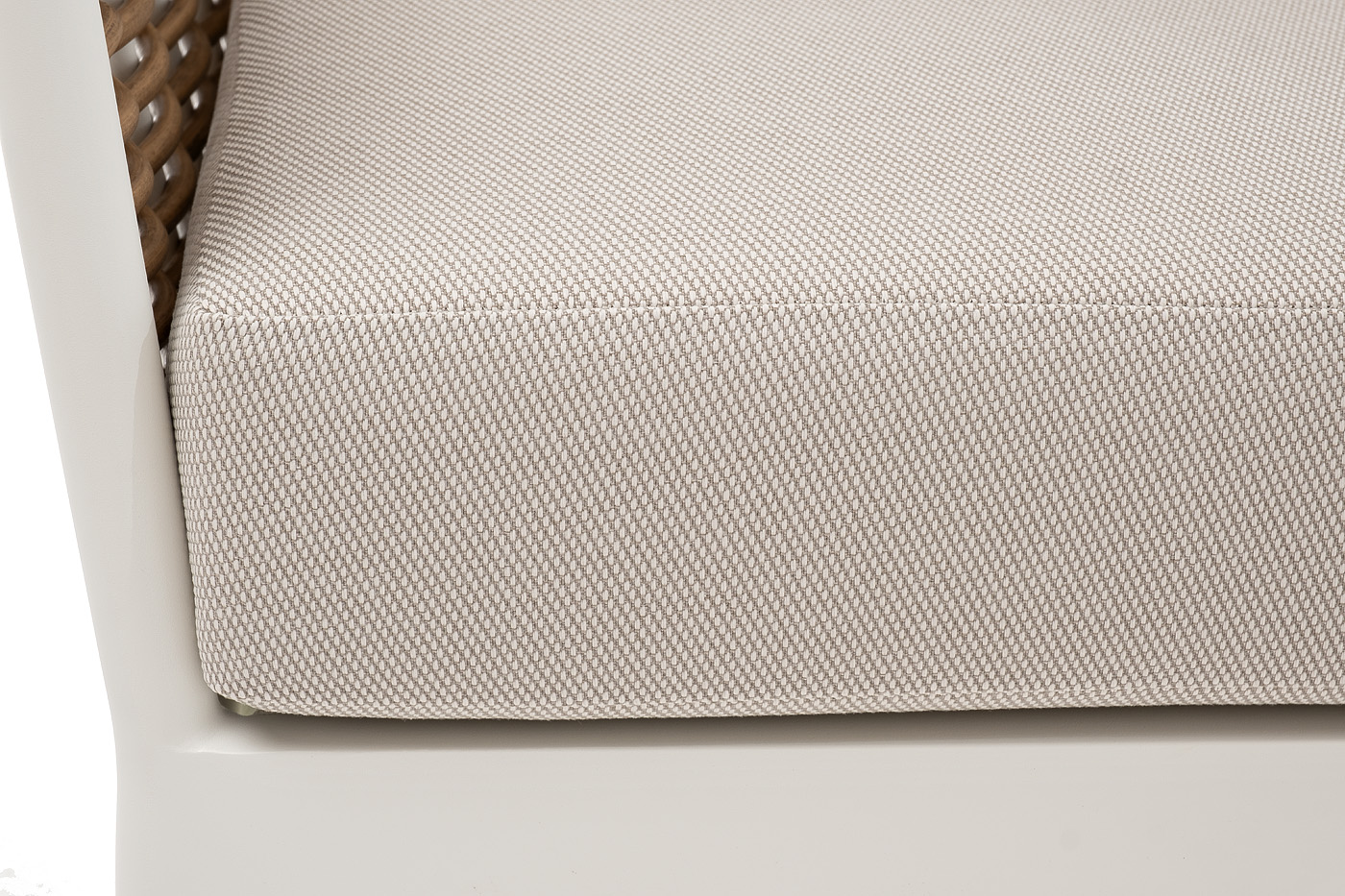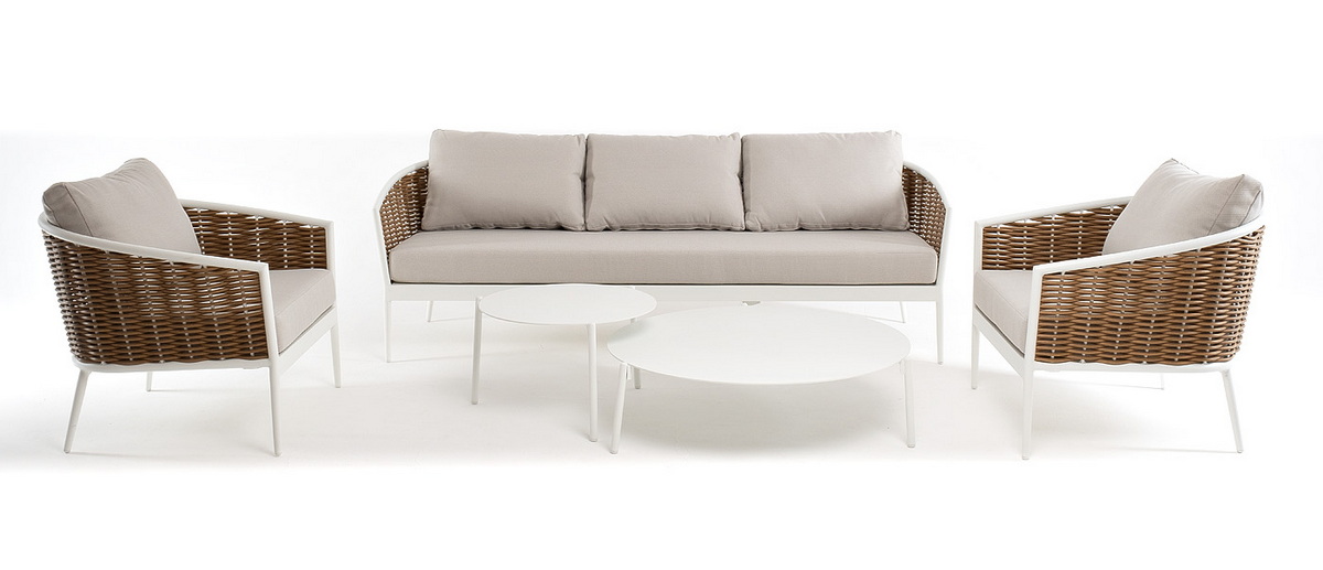 Каркас дивана и кресел из алюминия цвета слоновая кость, оплетен вручную соломенным ротангом. Подушки из ткани в тон. Столики из алюминия белого цвета.