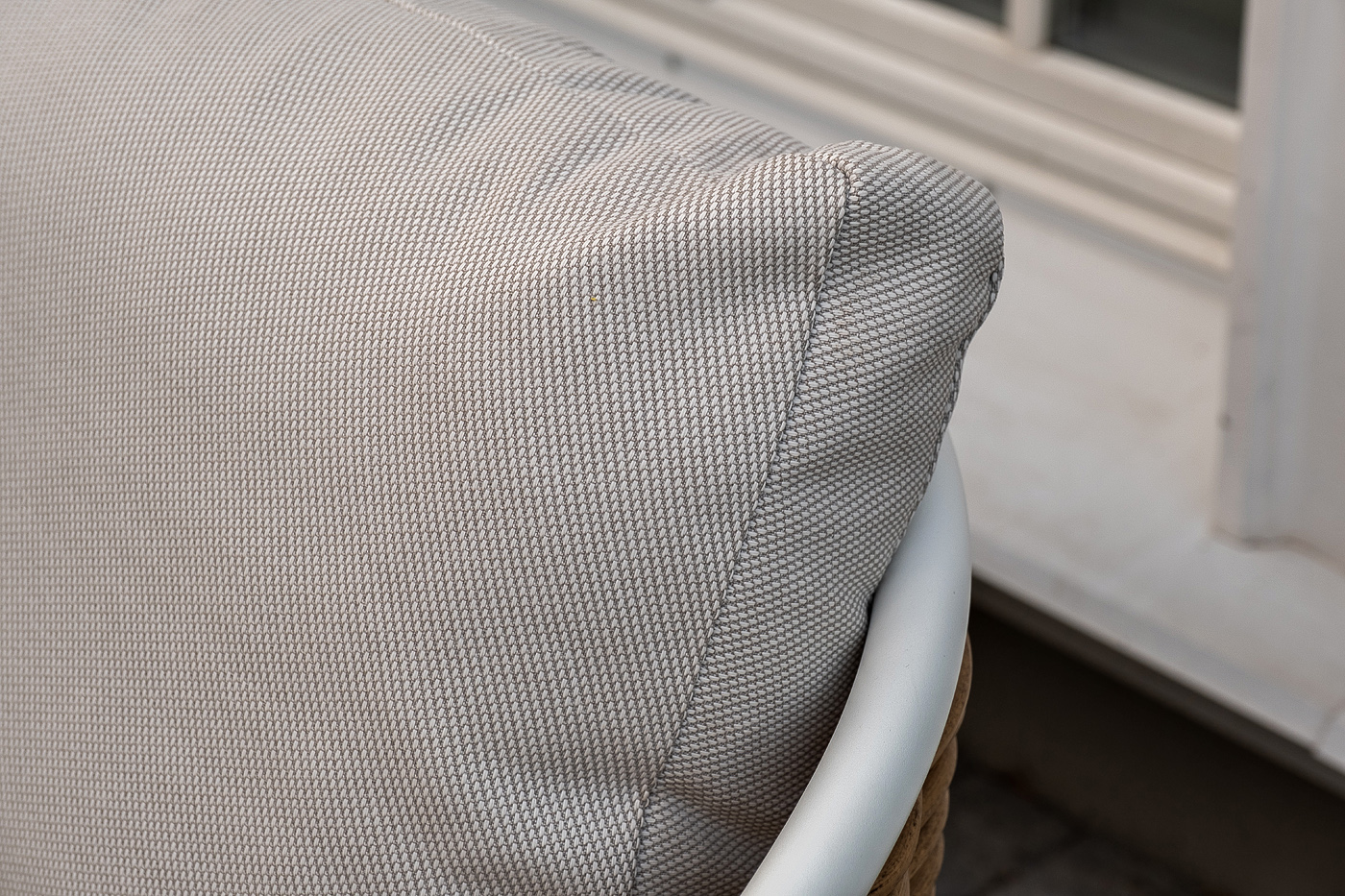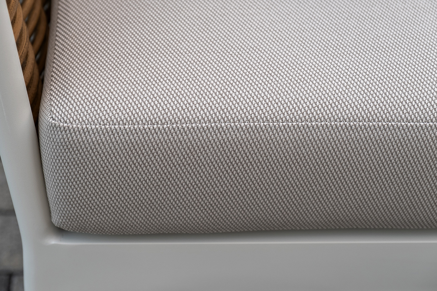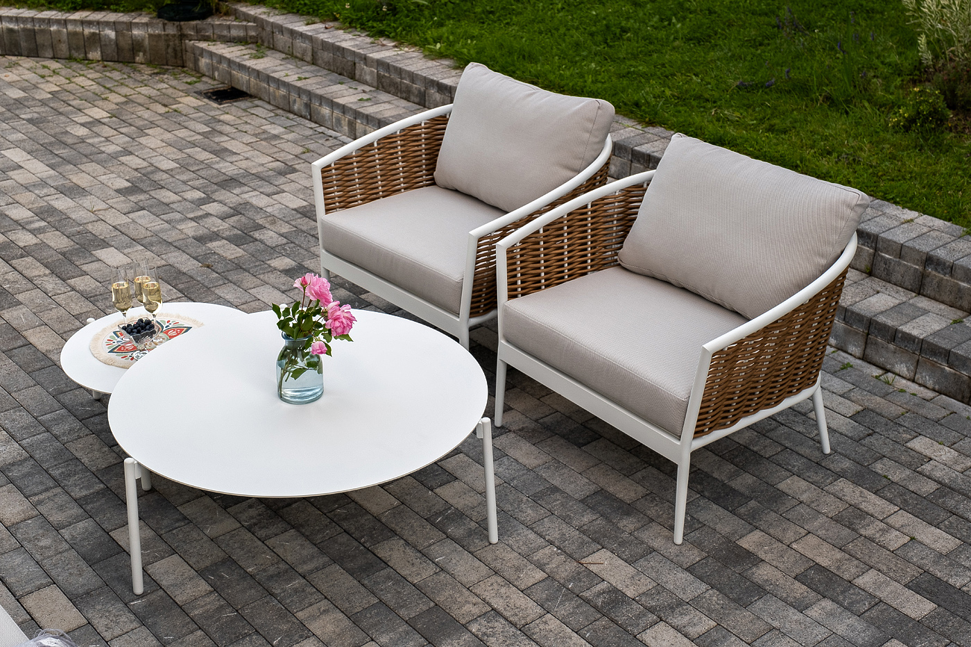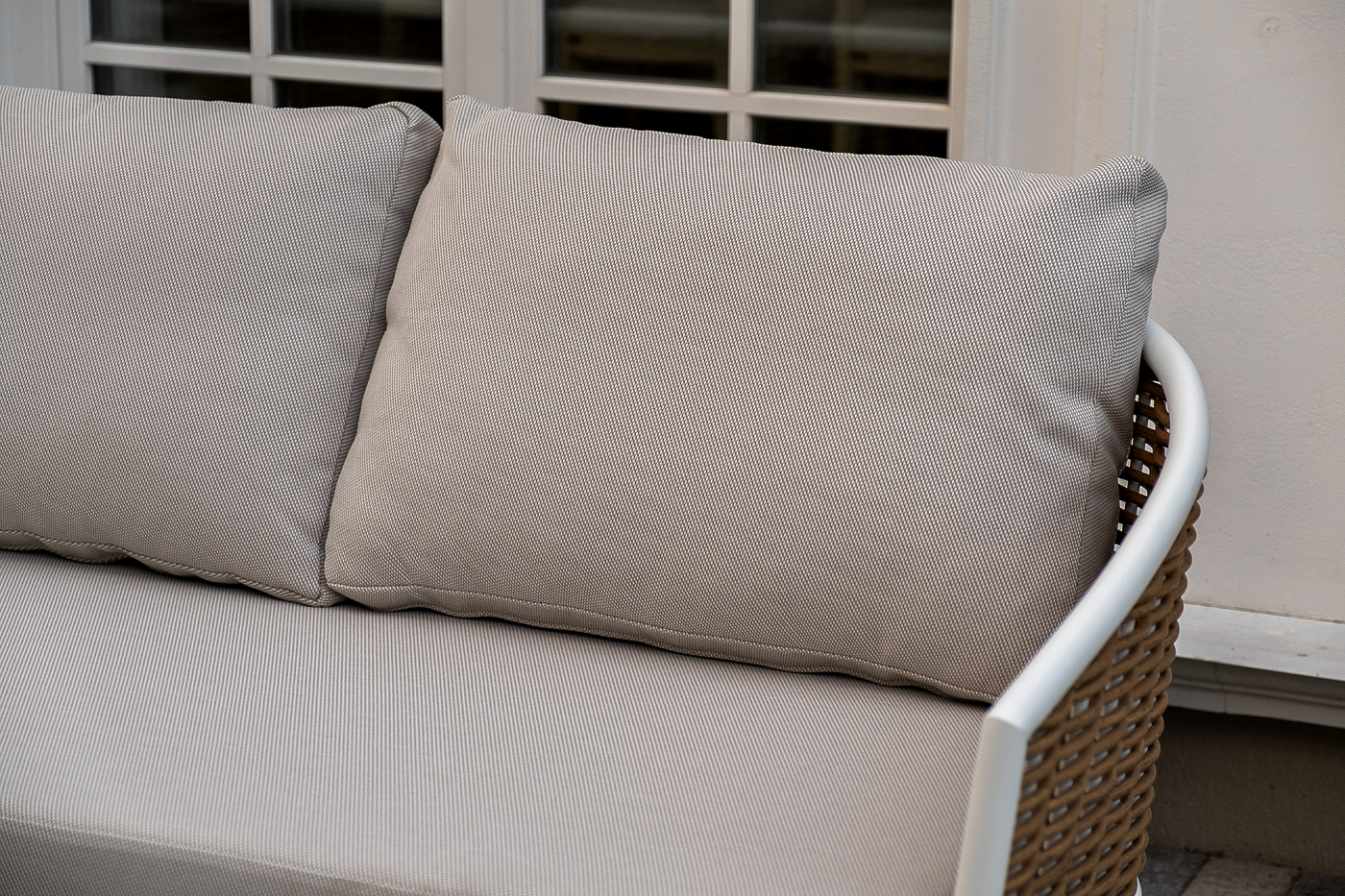 Вместительная лаунж-зона «Тоскана» привносит в ваше открытое пространство атмосферу уютного итальянского курорта. Комплект состоит из просторного трехместного дивана, двух удобных кресел и двух журнальных столиков разной высоты. Прочный алюминиевый каркас цвета слоновой кости, оплетенный вручную соломенным ротангом с круглым плетением 10 мм, создает воздушную и надежную конструкцию. Мягкие подушки в комплекте обеспечивают максимальный комфорт. Два столика позволяют гибко организовать пространство — высокий для напитков и книг, низкий для декора или дополнительных аксессуаров.