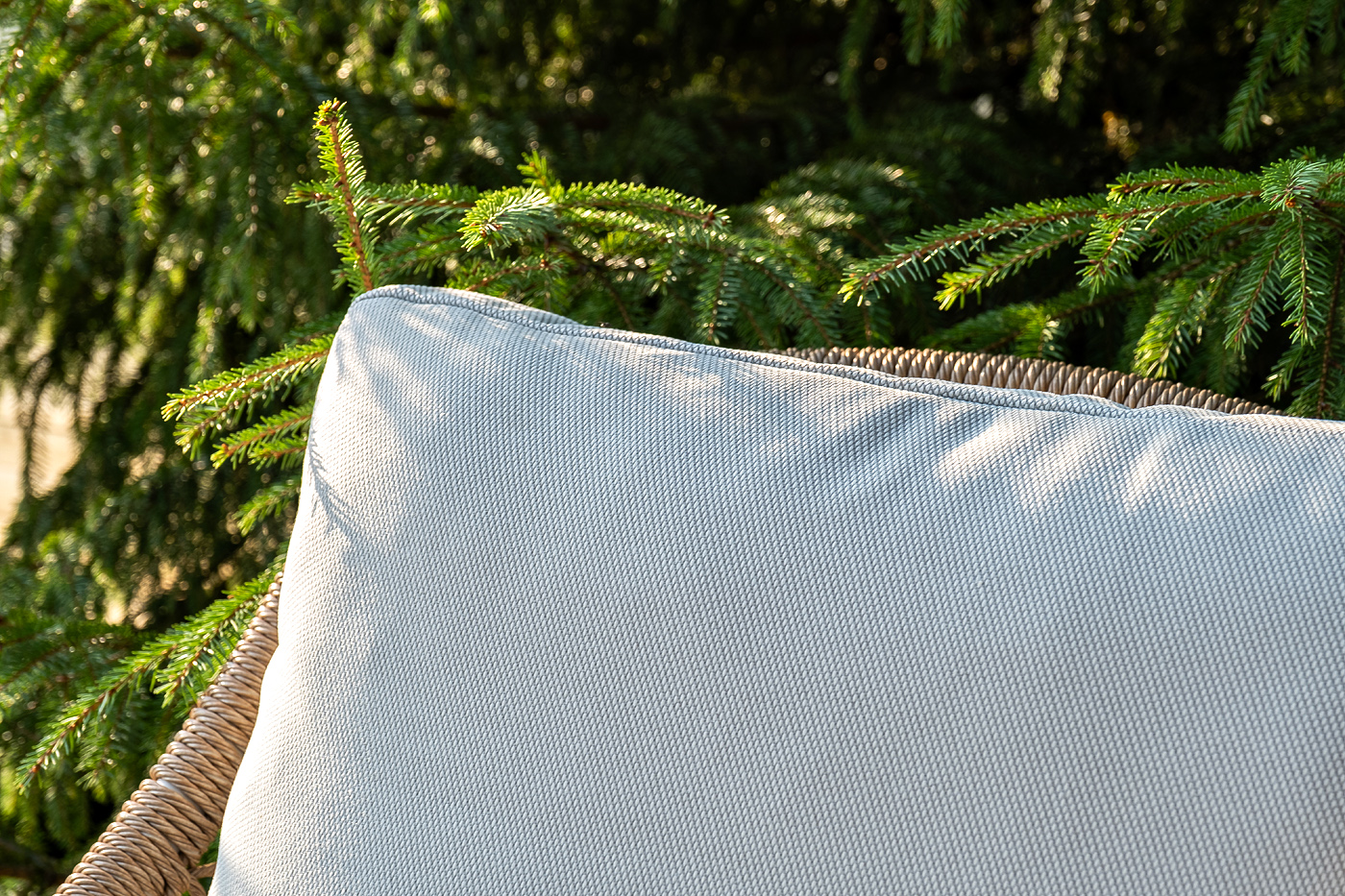 Полиэстер с плотностью 300 гр/м² — это износостойкий материал, который хорошо держит форму. Влагоотталкивающая пропитка защищает подушки от дождя и случайных пятен: жидкость скатывается, не впитываясь. Чехлы, скорее всего, съемные, что облегчает уход.