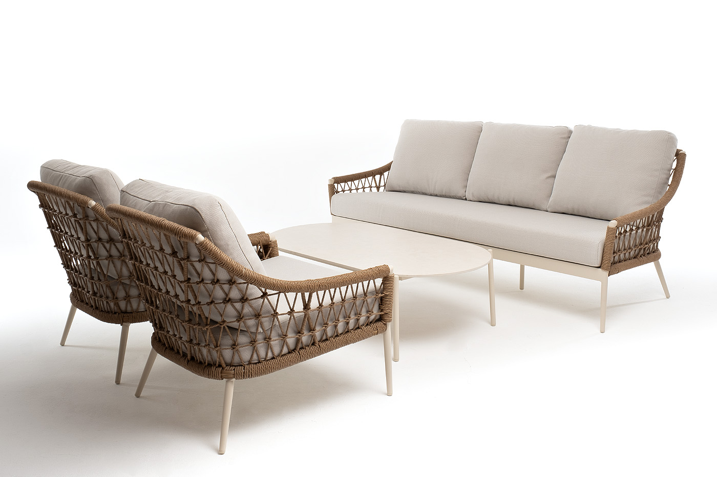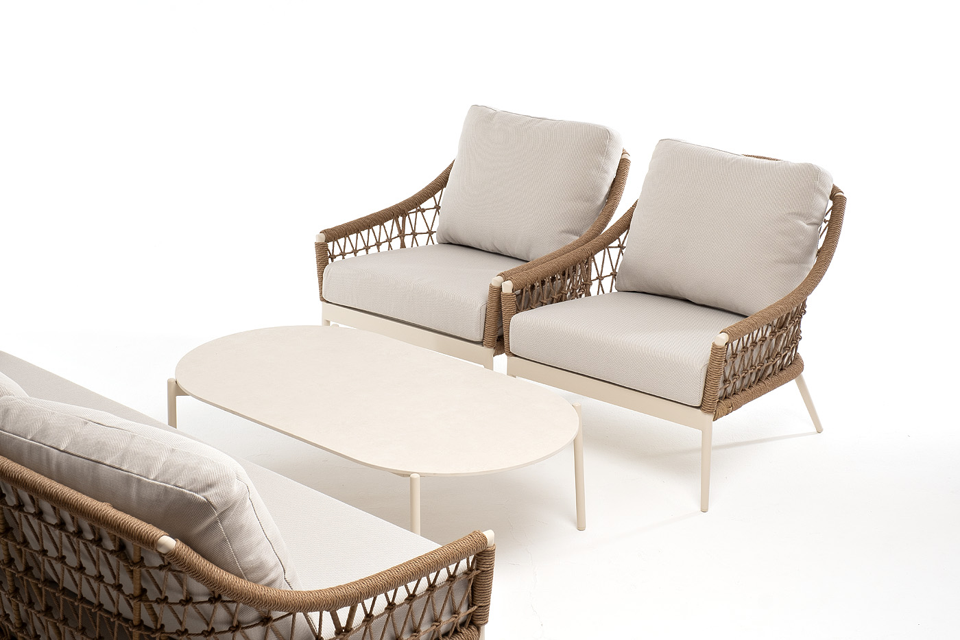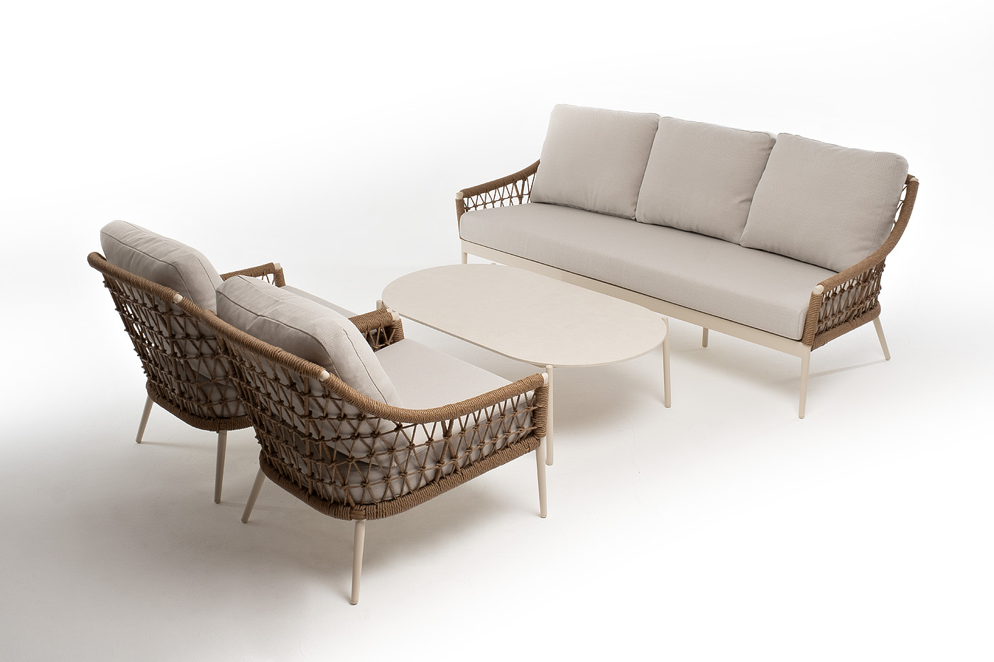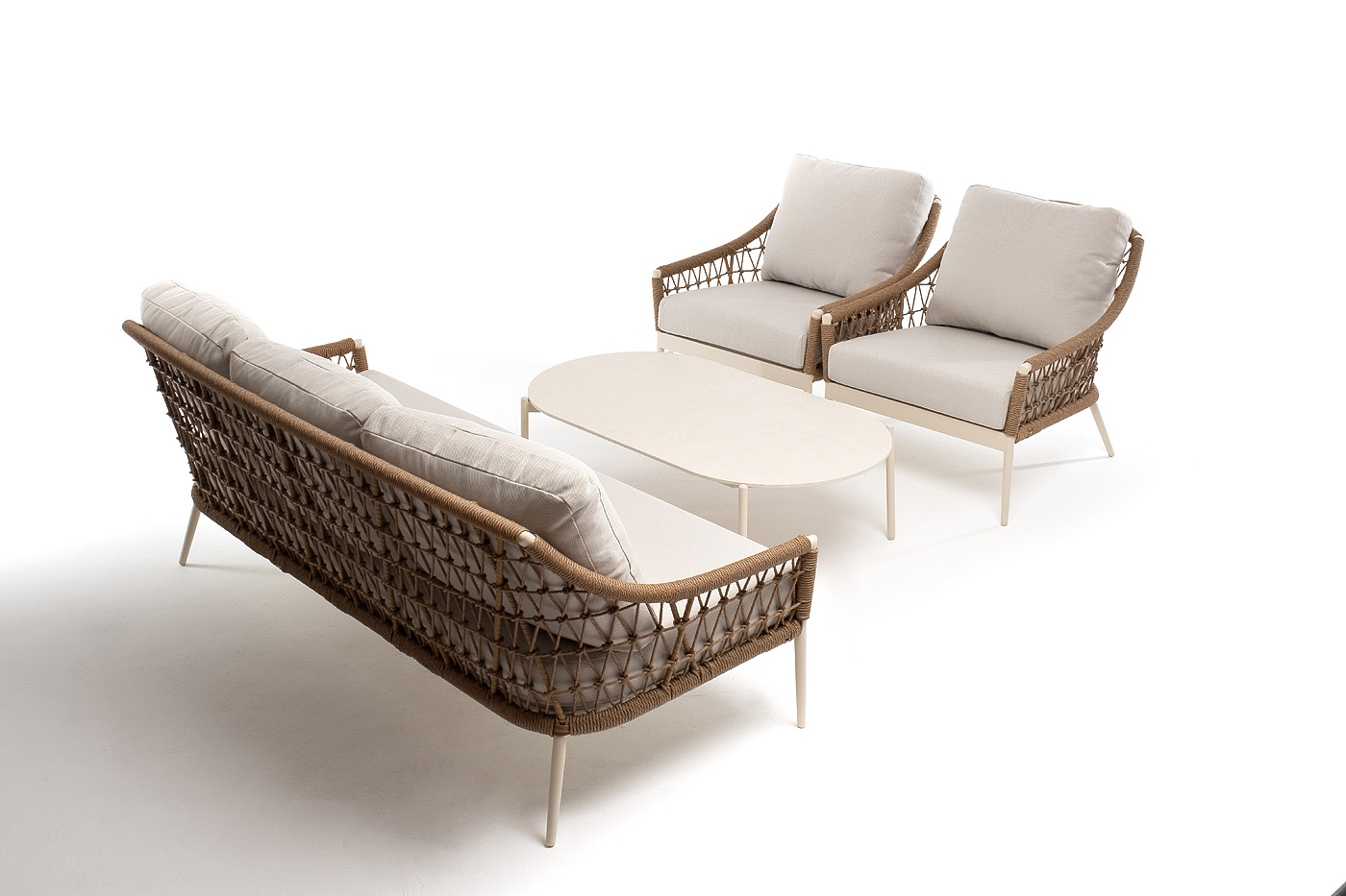 Вместительная лаунж-зона «Венеция» привносит в ваше открытое пространство атмосферу курортного отдыха и утончённого стиля. Комплект, вдохновлённый романтикой итальянских террас, состоит из просторного трехместного дивана, двух удобных кресел и элегантного журнального столика. Прочный алюминиевый каркас, оплетенный вручную искусственным ротангом нежного соломенного цвета, обеспечивает долговечность и лёгкость конструкции. Мягкие подушки в бежевых чехлах из влагоотталкивающего полиэстера дарят непревзойденный комфорт, а столик с овальной столешницей из искусственного камня завершает этот гармоничный ансамбль.