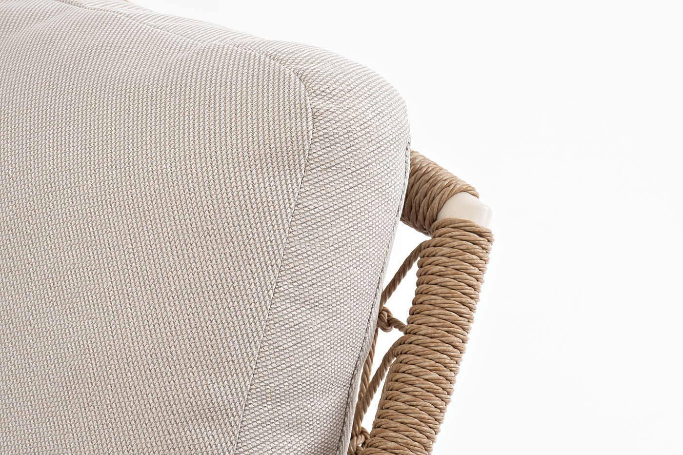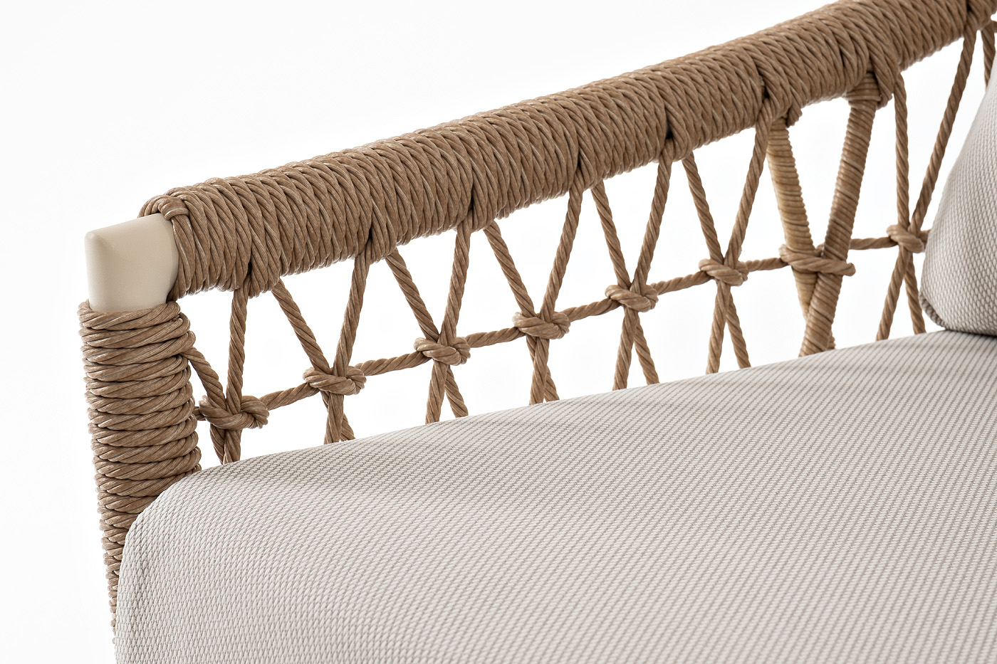 Каркас дивана и кресел выполнен из прочного алюминия, который не ржавеет и обеспечивает лёгкость конструкции. Снаружи он оплетен вручную качественным искусственным ротангом соломенного цвета. Мягкие подушки обтянуты плотной полиэстеровой тканью с влагоотталкивающей пропиткой. Столик имеет столешницу из искусственного камня.