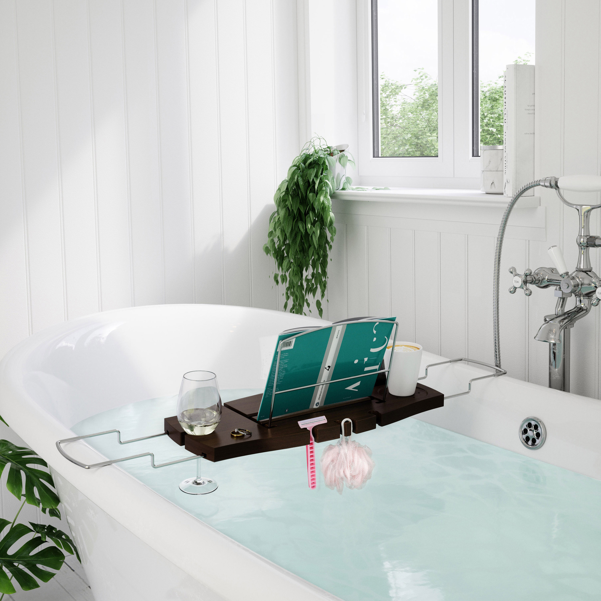 Полка для ванной позволит расслабиться после рабочего дня в компании любимого сериала или книги. Полка оснащена встроенной мыльницей, прорезью для бокала с вином, подставкой для книги или iPad, отверстием для телефона и держателем для бритвенного станка. Аксессуар выполнен из экологически чистого бамбука, который отличается стойкостью к повышенной влажности. Благодаря выдвижным хромированным кронштейнам полку можно устанавливать на любую ванную шириной до 94 см.