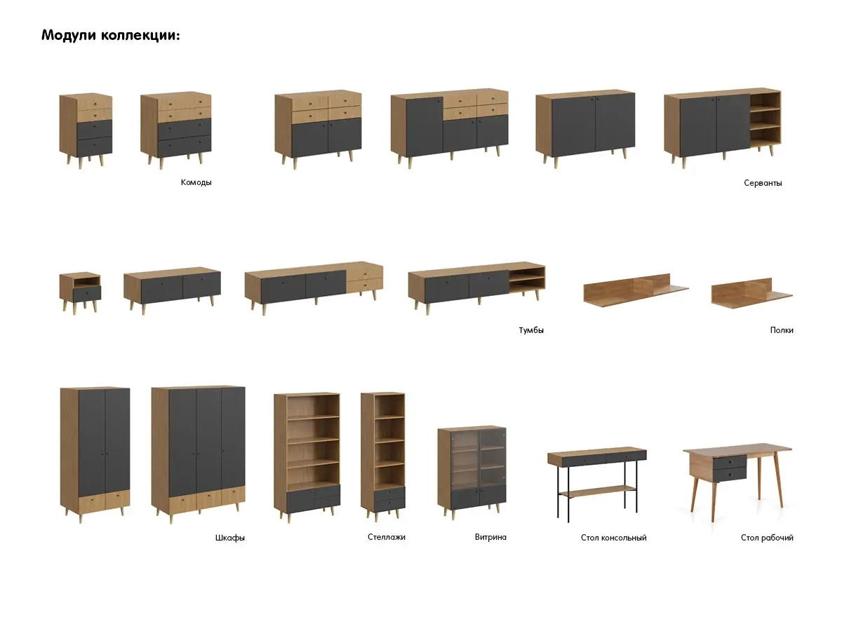 Корпусная мебель, с которой можно составить множество решений для гостиной, детской, кухни, спальни, прихожей, рабочей зоны. Комоды, шкафы, тумбы, столы, витрины, полки, серванты характеризуются универсальностью, многозадачностью, надёжными устойчивыми конструкциями. Имеют выразительный внешний вид, вдохновленный направлением ретро. Смотрятся легко и воздушно за счет деревянных ножек, минимального количества декоративных элементов, спокойных природных оттенков.