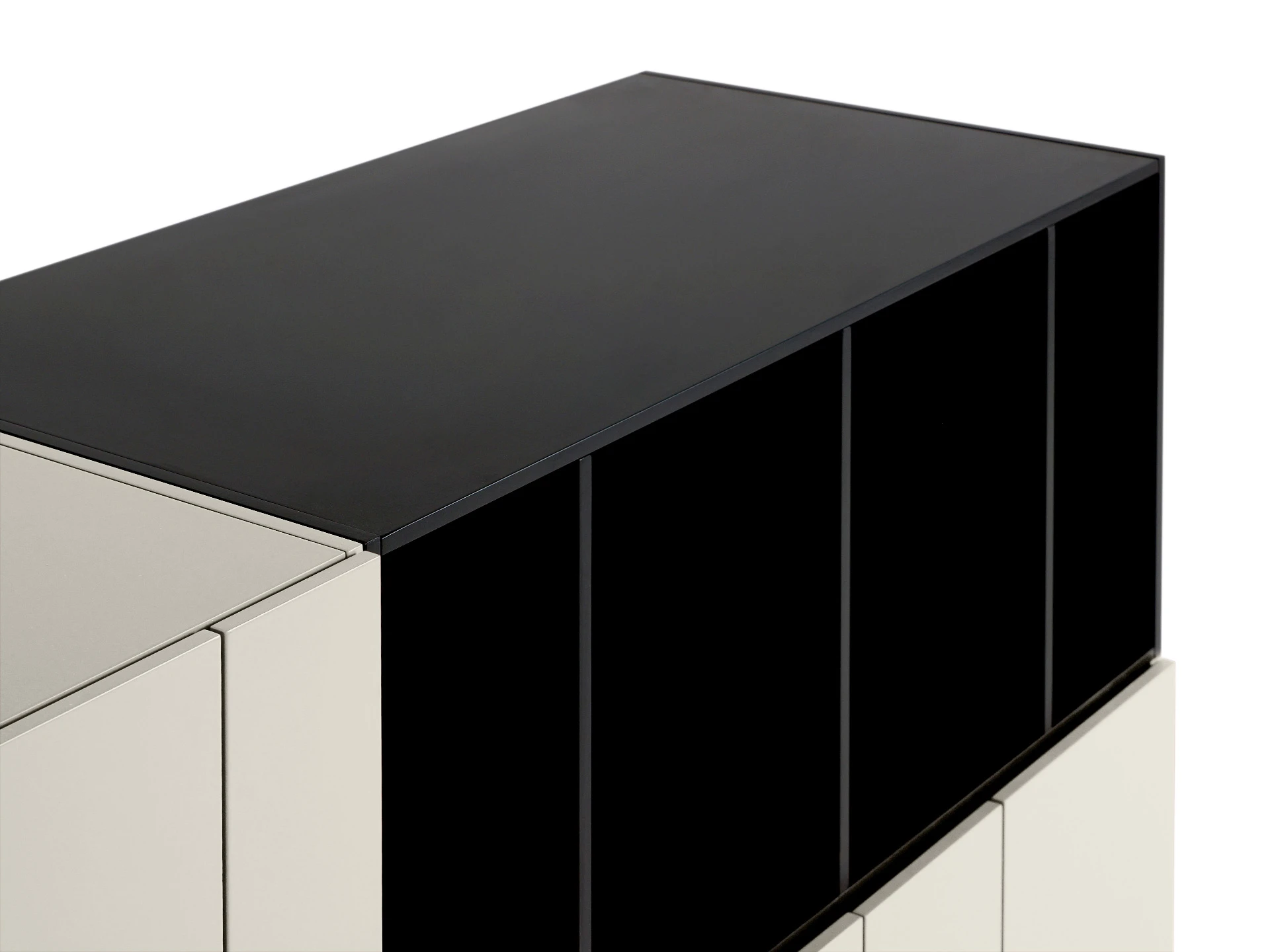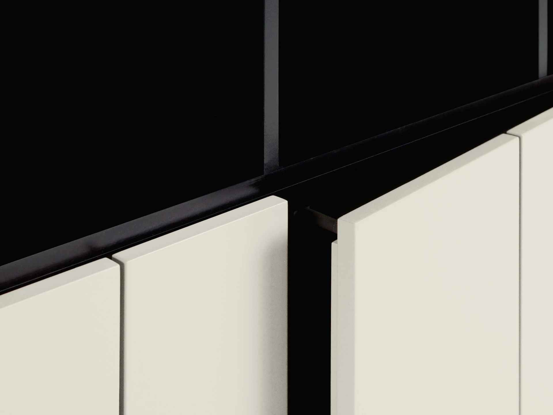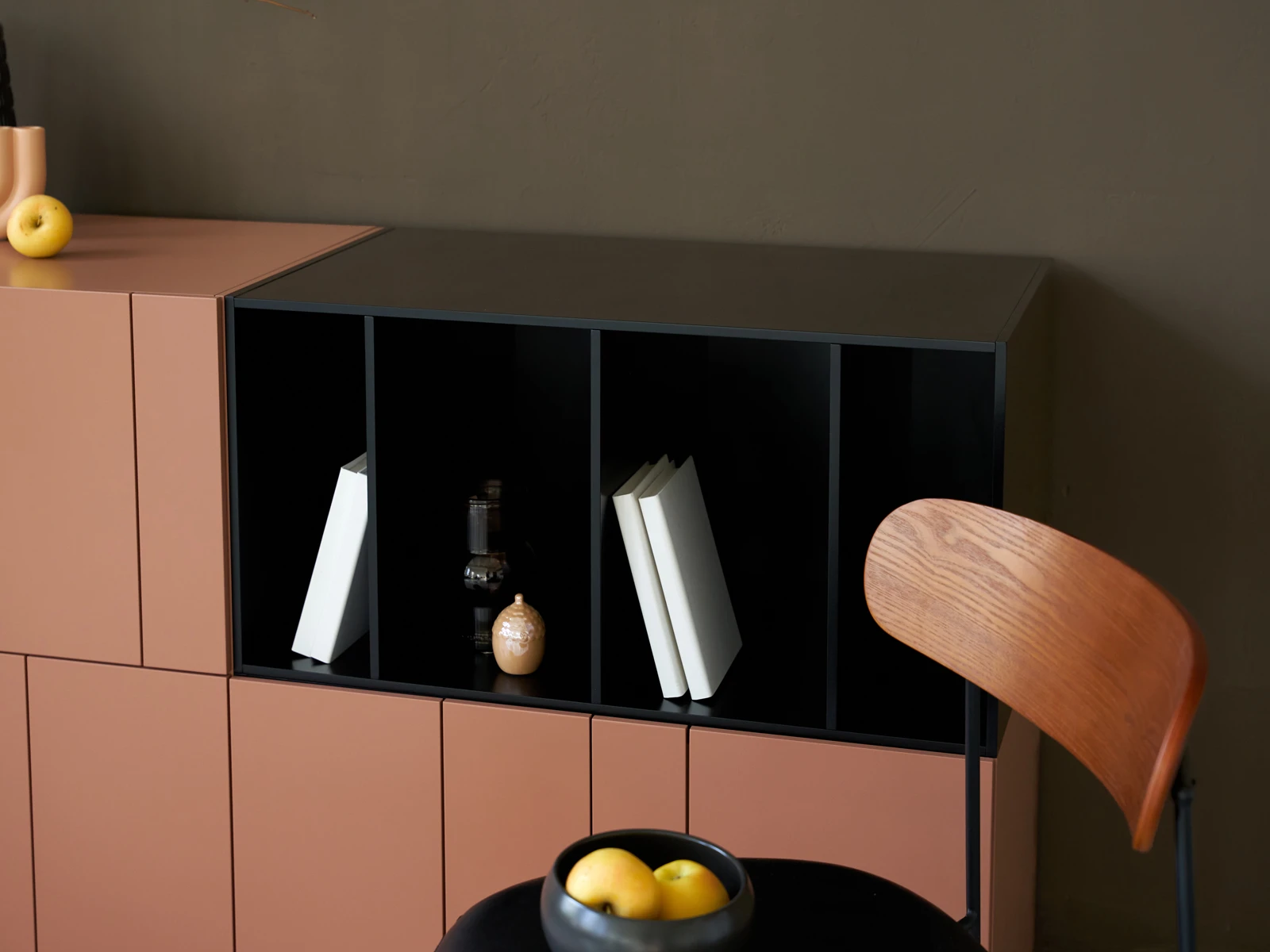 Материал корпуса и фасада: МДФ 16 мм., МДФ 10 мм. Детали окрашены эмалью: черной и в цвет коричневый агат Ral 040 50 20. Двери открываются по принципу «нажал – открыл» с помощью толкателей. Сервант установлен на регулируемые опоры. Задняя стенка выполнена также из окрашенной МДФ. Сервант рекомендуется крепить к стене.