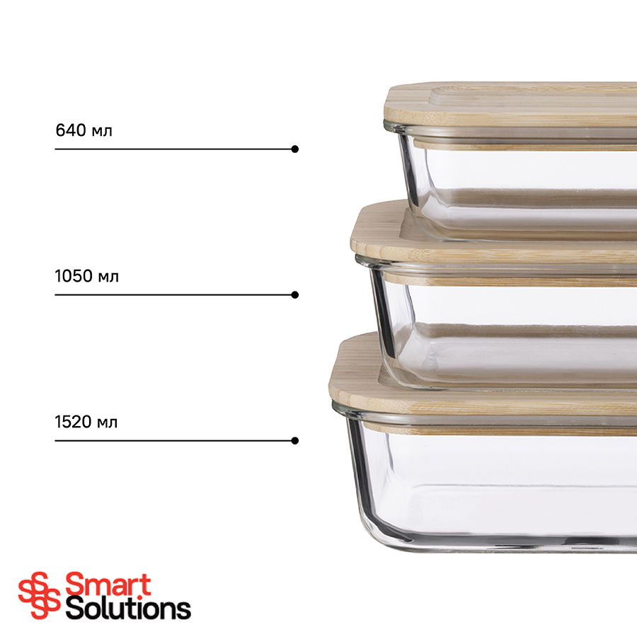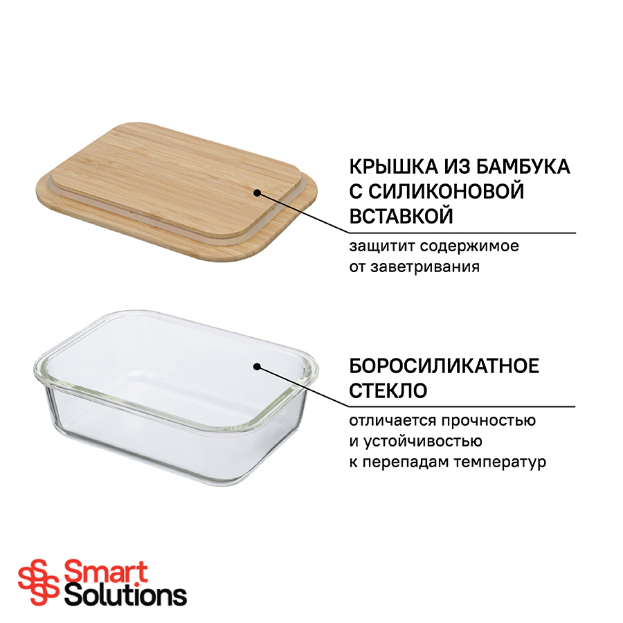 Контейнер с бамбуковой крышкой от бренда Smart Solutions идеально подойдет для хранения продуктов и готовой еды, а также для запекания блюд в духовке. Особенности и преимущества: - Контейнер из боросиликатного стекла устойчив к температурным перепадам, механическим повреждениям, легко очищается после использования. - Материал является безопасным для здоровья, не вступает в реакцию с продуктами, не содержит вредных соединений, в том числе Бисфенола-А. - Крышка из натурального бамбука с силиконовой вставкой обеспечивает плотное закрывание. Материалы: боросиликатное стекло, бамбук, силикон. Объем: 1520 мл. Можно мыть в посудомоечной машине, замораживать, использовать в микроволновой печи и духовке при температуре до 560? без крышки. Крышку рекомендуется протирать влажной тканью. Запрещается применение абразивных материалов и агрессивной бытовой химии.