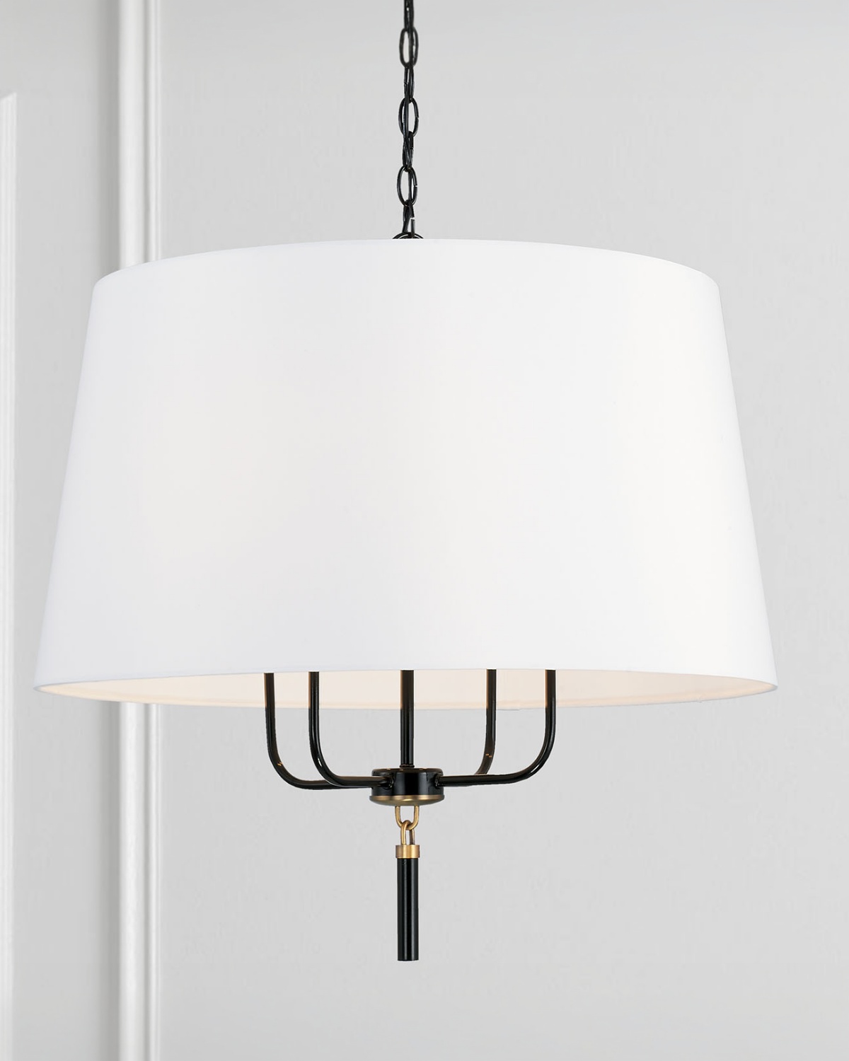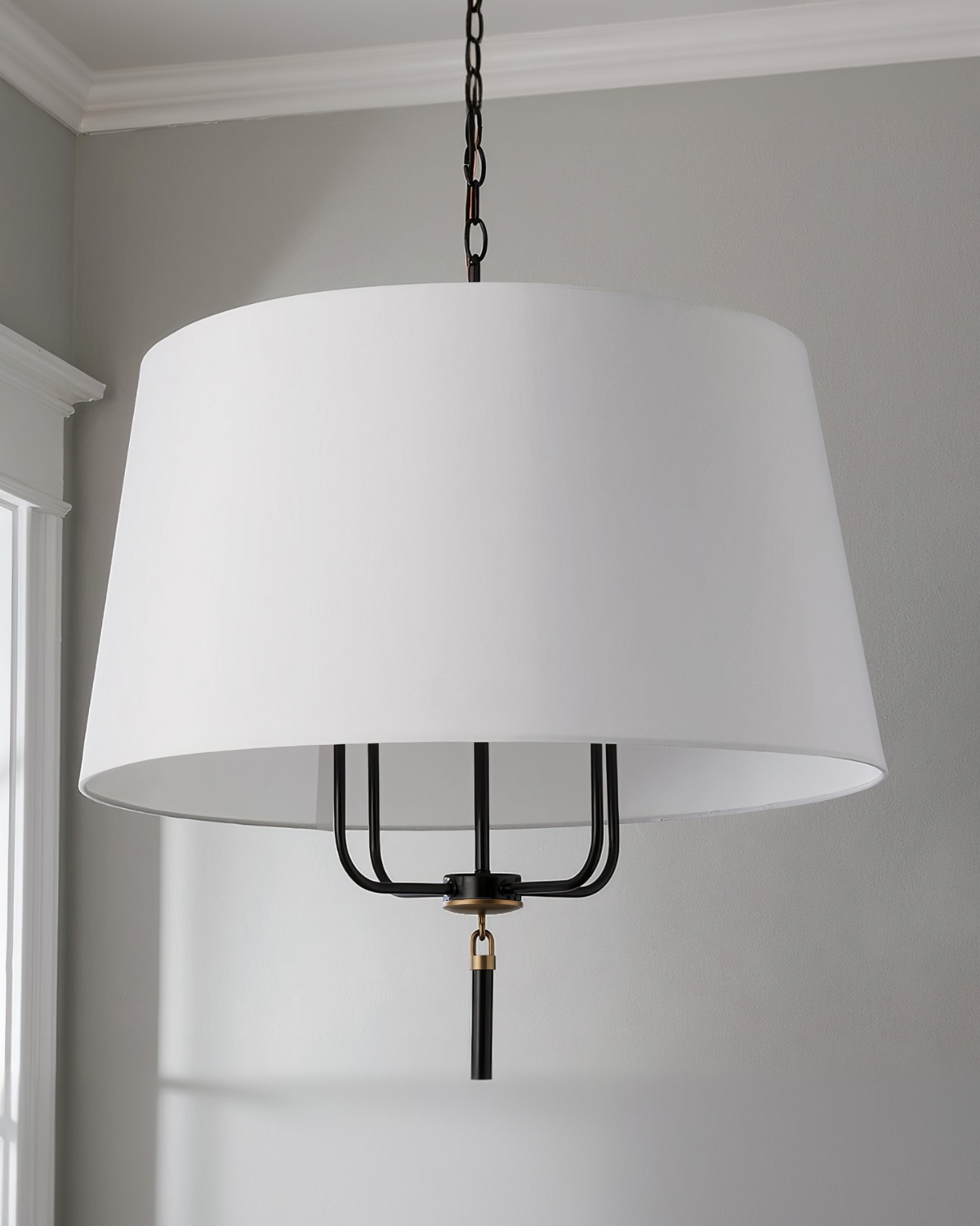 Люстра “Аврора” с чёрным металлическим акцентом – это элегантное сочетание классического дизайна и современных акцентов, которое станет изысканным украшением любого интерьера. Модель выполнена в сдержанной цветовой гамме и гармонично объединяет в себе различные материалы: изящные металлические рукава придают светильнику лёгкость и утончённость, а белый тканевый трапециевидный абажур создаёт мягкое и рассеянное освещение, добавляя уюта в пространство. Особый шарм люстре придаёт акцентная чёрная деталь с латунной петлицей, которая служит смелым и стильным завершением её силуэта. Этот декоративный элемент подчеркивает изысканность дизайна и добавляет ноту роскоши. Люстра “Аврора” идеально впишется в интерьеры, выполненные в классическом, скандинавском или современном стиле, став акцентом в гостиной, спальне или столовой.