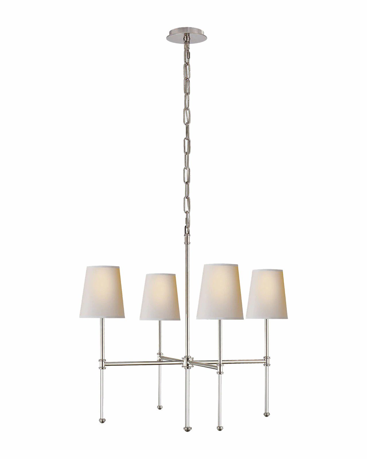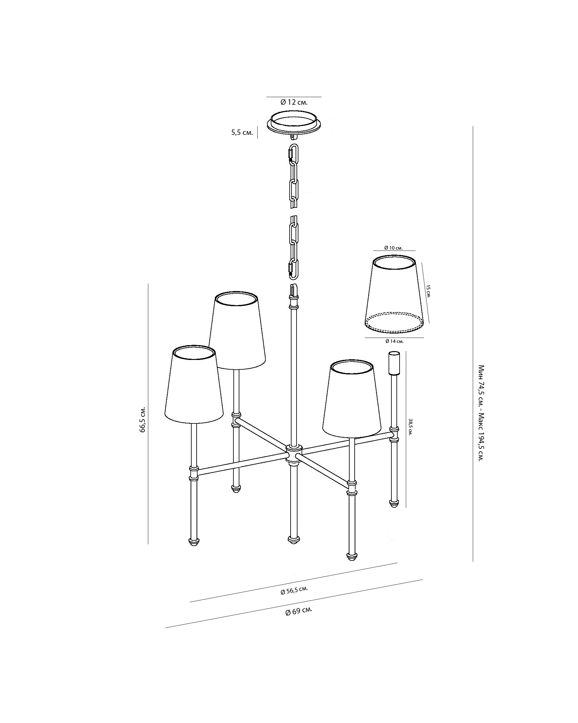 Сочетая изысканный стиль и современную функциональность, люстра "Дэмиан" осветит гостиные, столовые или холлы, не перегружая пространство. Квартет источников света выходит из центра на аккуратных дужках с серебряной отделкой. Каждая лампа покрыта сужающимся к верху плафоном, который рассеивает свет и создает приятное для глаз свечение. Длина цепи : 15 см. Длина провода: 25 см. Количество ламп: 4шт. Тип цоколя: Е12 . Мощность лампы: 240W. Общая мощность : 480W