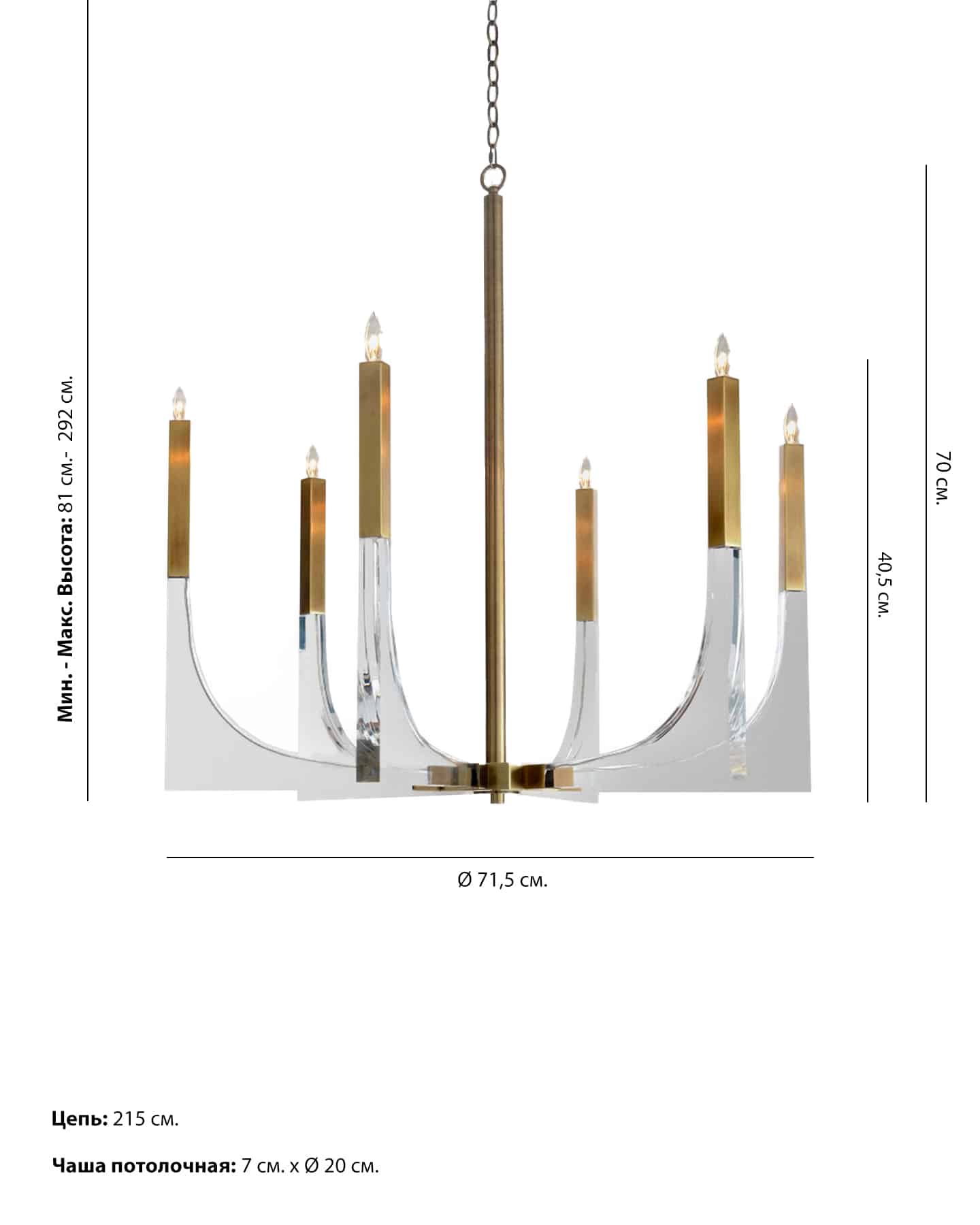 Люстра "Дэйзи" - сочетание классической формы с выразительным современным дизайном, рожки с 6 подсвечниками изготовлены из акрила, металлические элементы в полированном золотом цвете. Длина цепи : 25 см. Длина провода: 25 см. Количество ламп: 6 шт. Тип цоколя: E14. Мощность лампы: 60W. Общая мощность : 360W