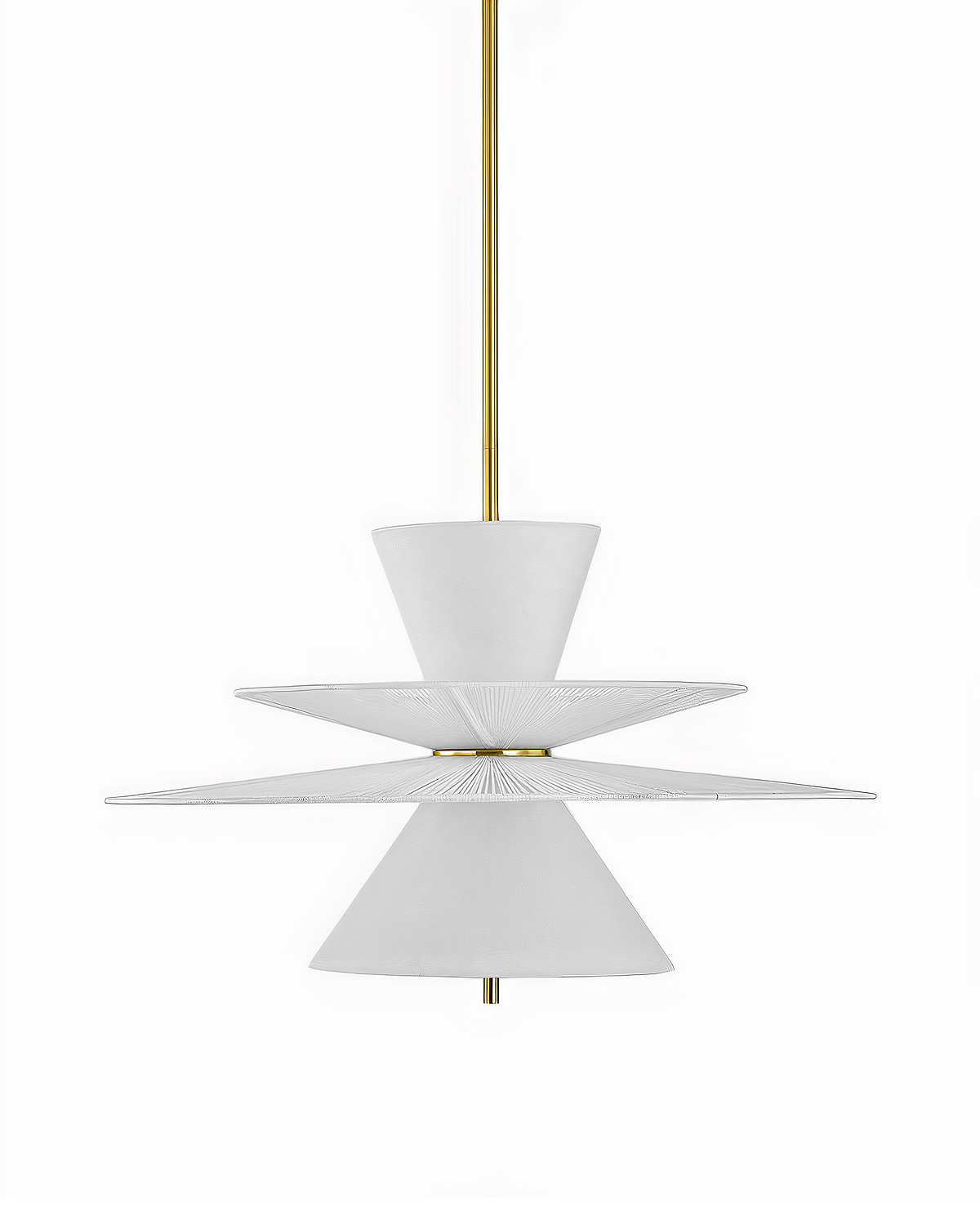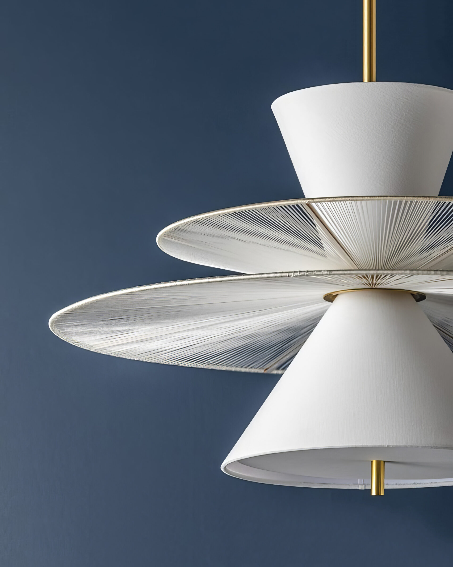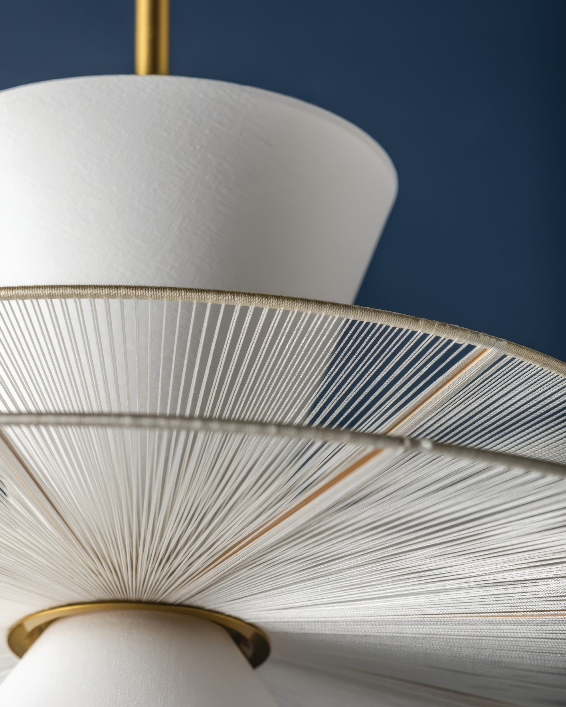 Подвесной светильник “Вивер” – это предмет интерьера, который сочетает в себе стиль, функциональность и оригинальный дизайн. В основе его дизайна лежит концепция игры света и тени. Конусообразные льняные абажуры, выступают как верхний и нижний источник света, создают удивительный эффект освещения, напоминая форму песочных часов. Эта конструкция обеспечивает равномерное и мягкое освещение помещения, создавая уютную и атмосферную обстановку. Что делает светильник по-настоящему уникальным, так это его скульптурный силуэт. Два больших подвесных диска, напоминающие потолочный вентилятор, придают светильнику ощущение движения, легкости, воздушности. Этот элемент дизайна придает динамику, делая его более живым и интересным. Белый цвет материала создает чистый и свежий вид светильника сверху, что делает его универсальным для различных интерьеров. Светильник может использоваться как люстра в гостиной или обеденной зоне, и как подвесной светильник над барной стойкой. Его стильный и современный дизайн гармонично впишется как в классические, так и в современные интерьеры, добавляя и подчеркивая в них еще больше стиля.