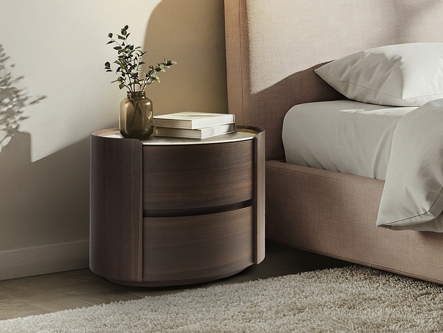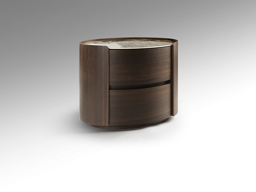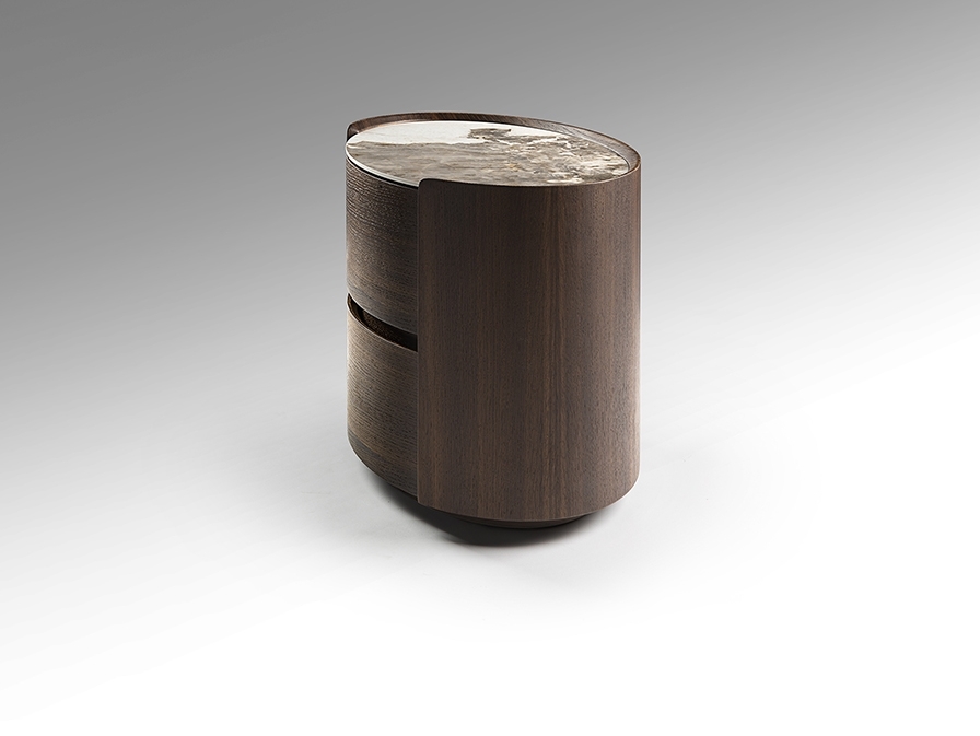 Овальный ночной столик с двумя ящиками на направляющих. Изготовлен из фанеры с отделкой под тёмный дуб. Столешница из фарфора с отделкой под мрамор с прожилками.