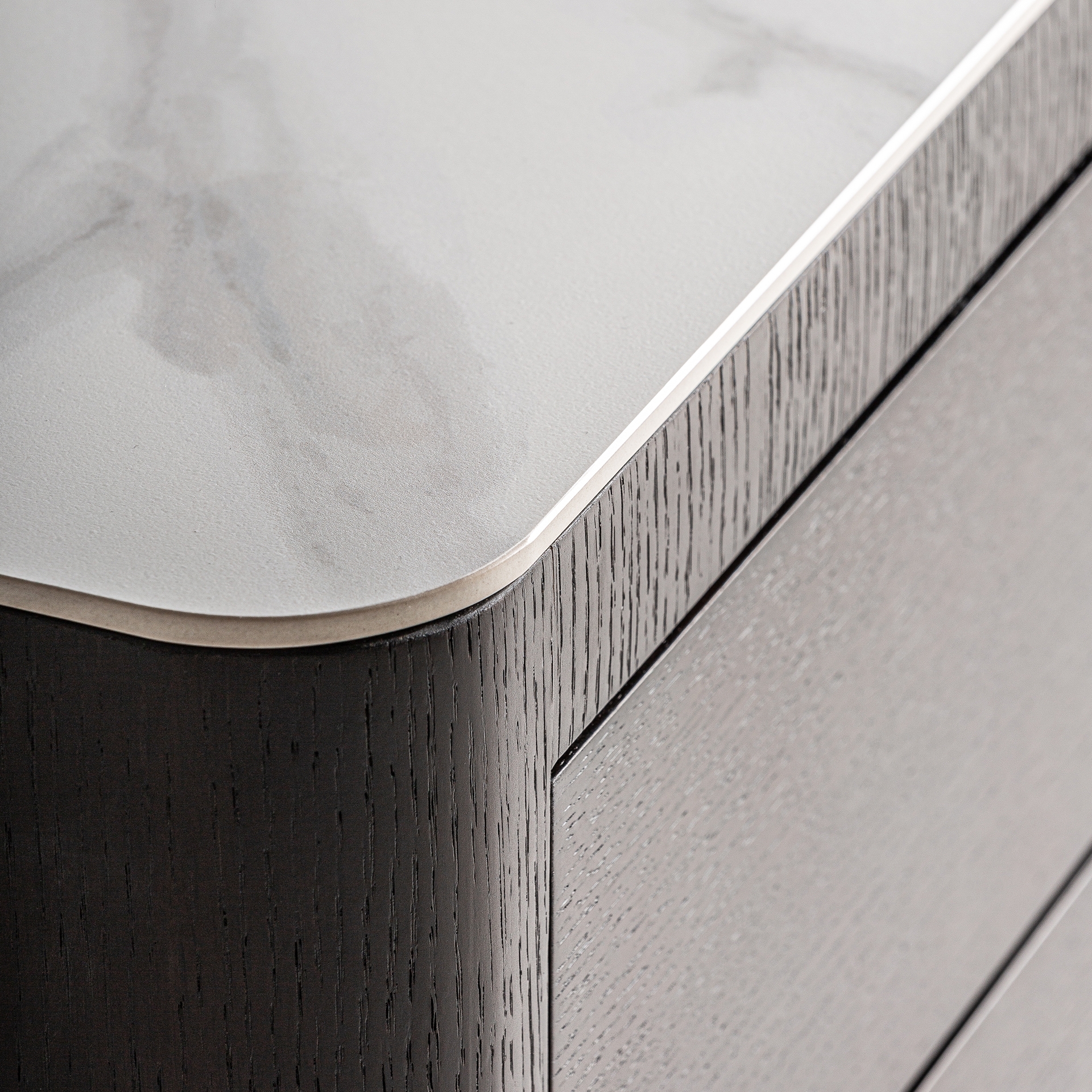 Цельная тумбочка коричневого цвета в стиле арт-деко. Изготовлен из древесины марки DM в сочетании с дубовым шпоном и спеченным камнем. Ширина: 55 см, Глубина: 45 см, Высота: 47 см.