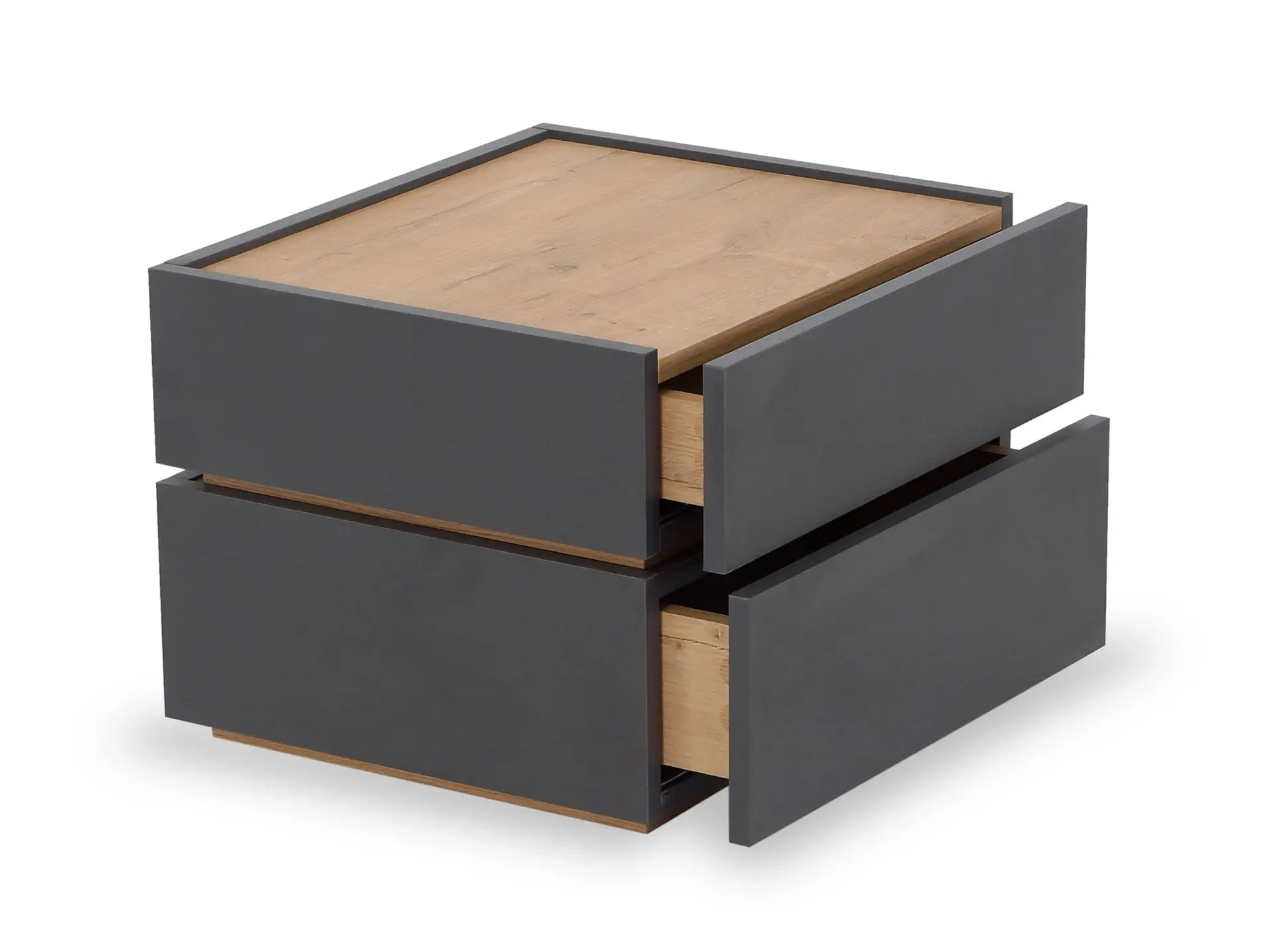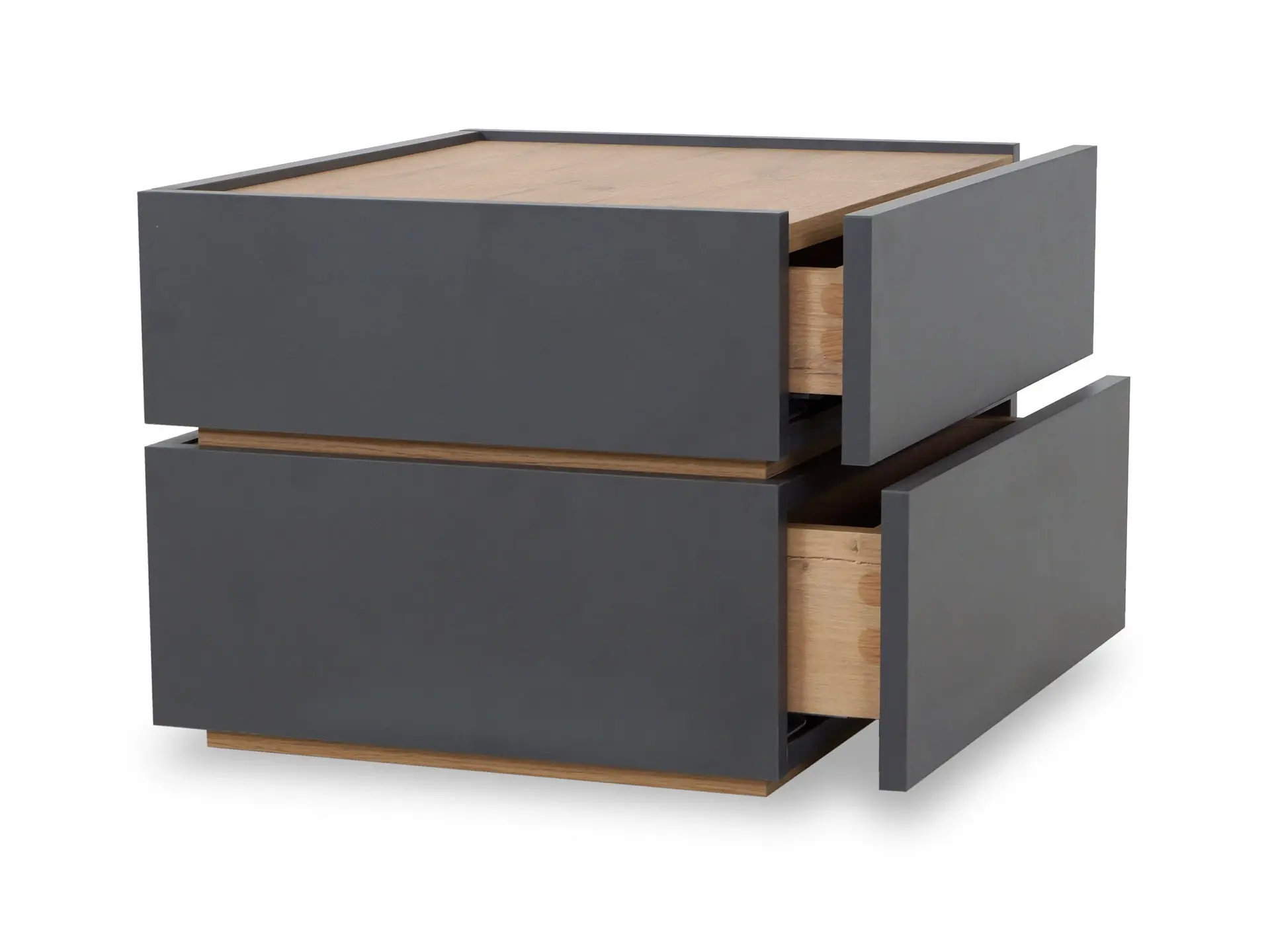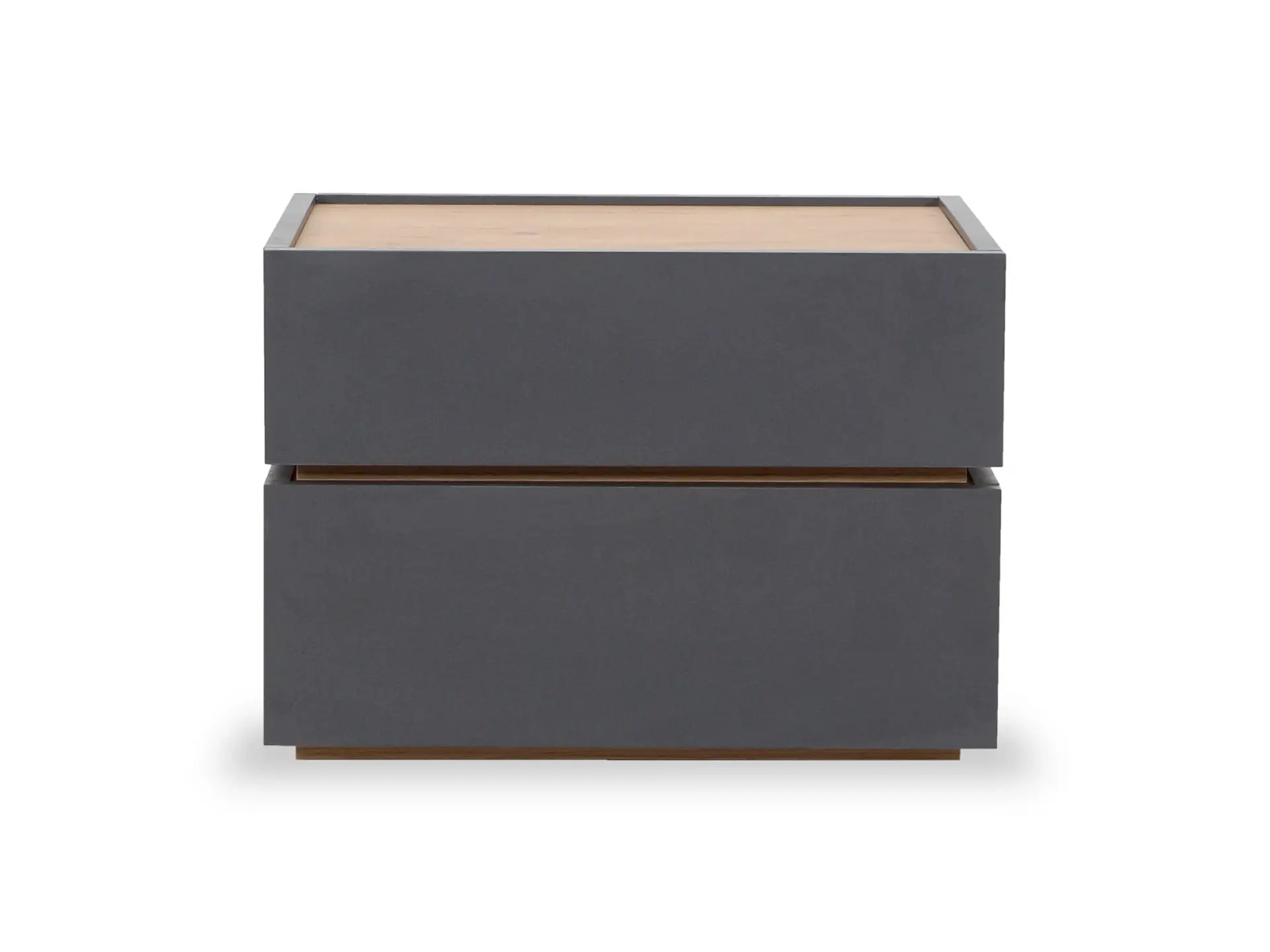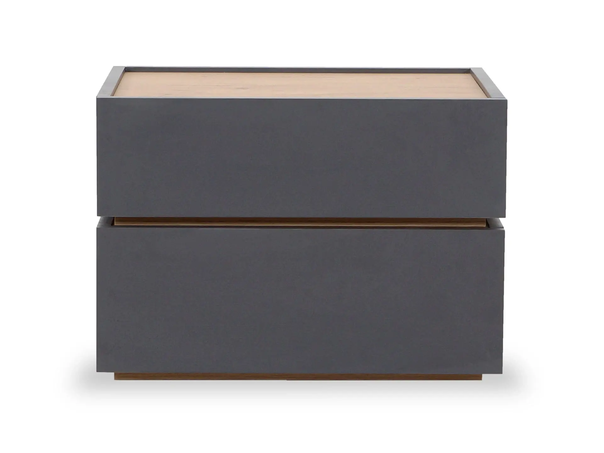 Тумба прикроватная с двумя ящиками. Выполнена из ЛДСП, дно ящиков ДВПО. Ящики на скрытых направляющих Push to open. Наличие фетровых подпятников.