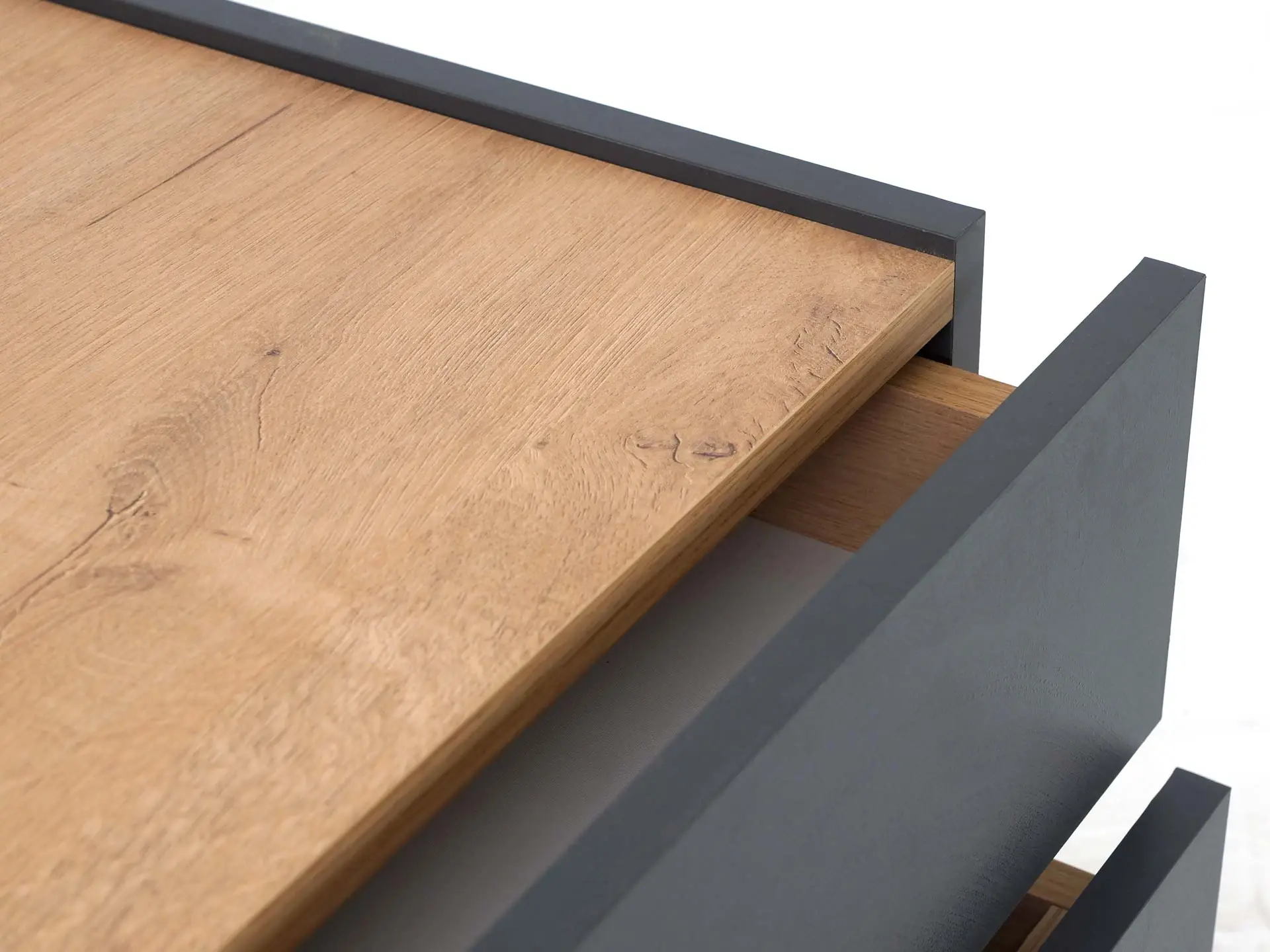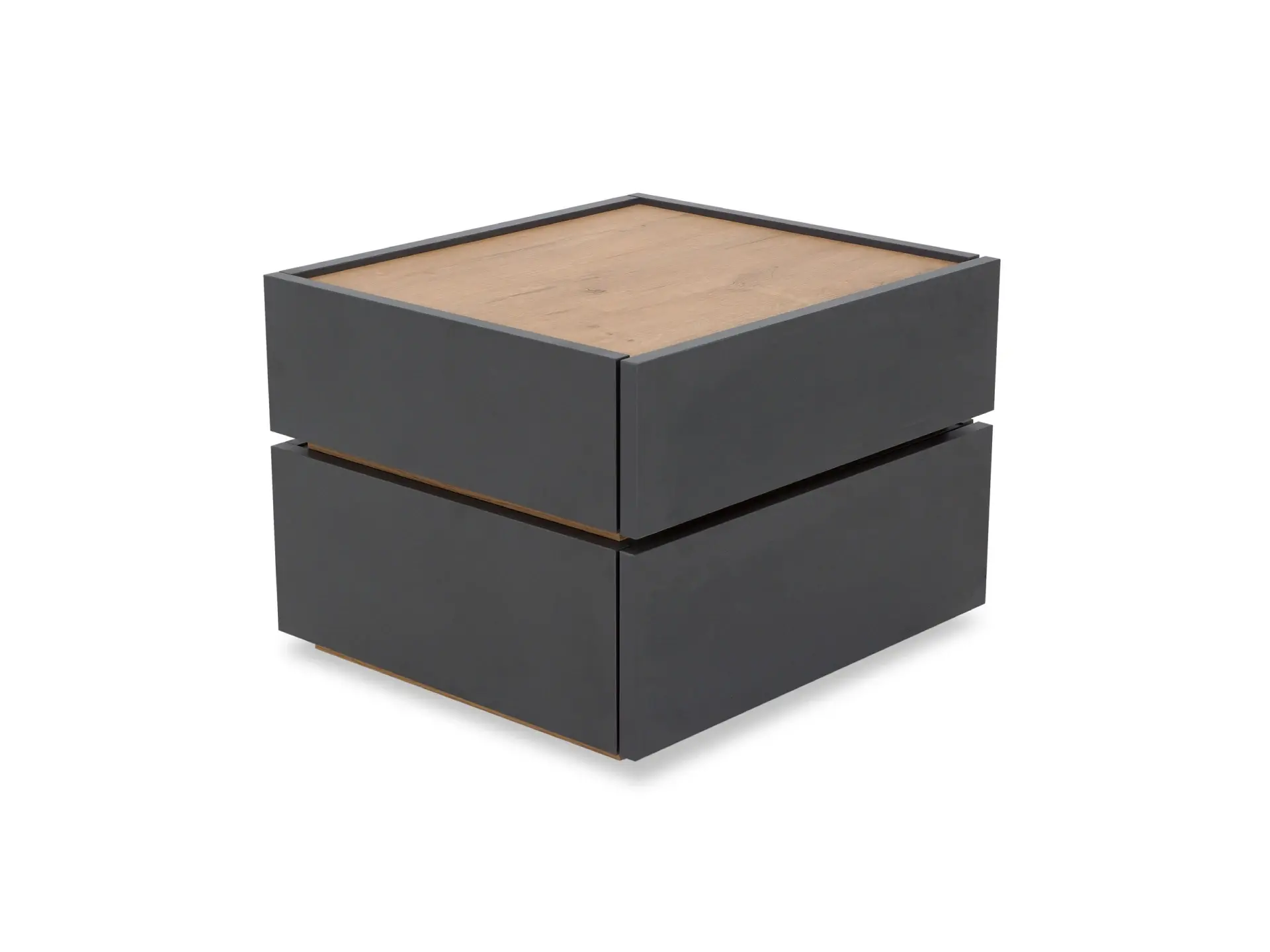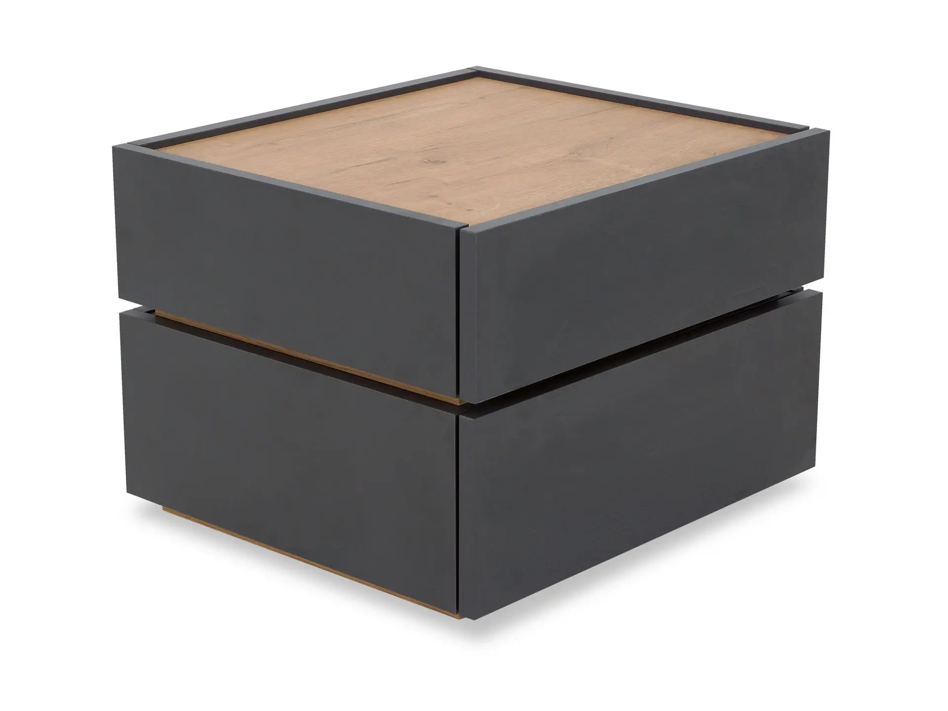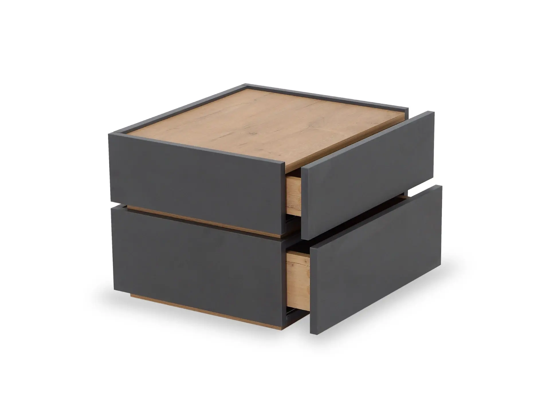 Тумба прикроватная с двумя ящиками. Выполнена из ЛДСП, дно ящиков ДВПО. Ящики на скрытых направляющих Push to open. Наличие фетровых подпятников.