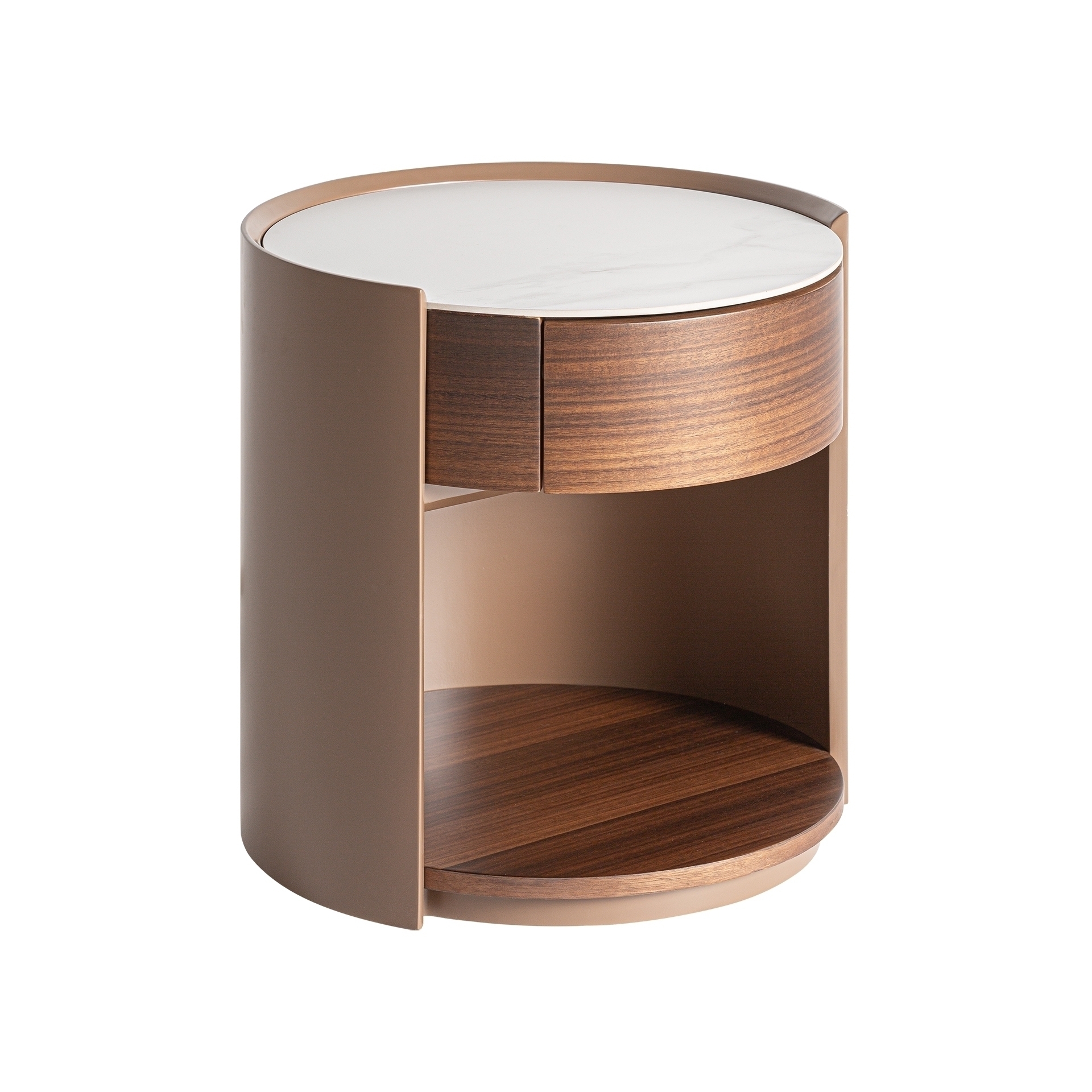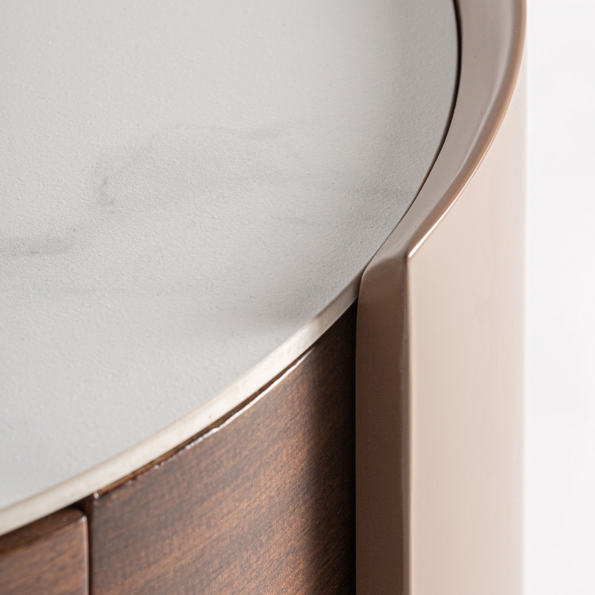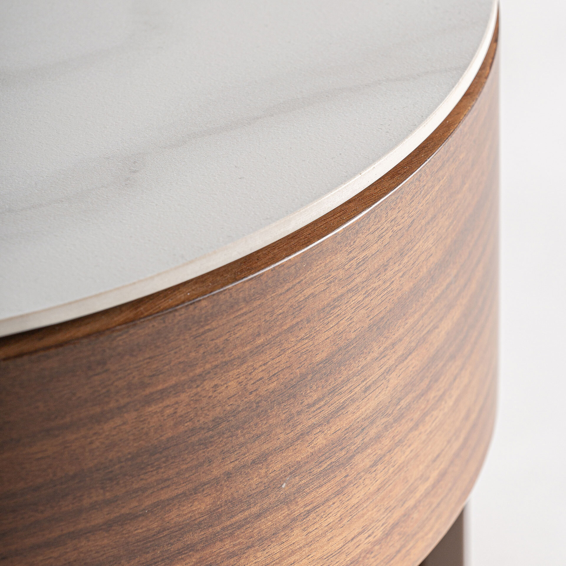 Тумбочка Giswil, коричневого цвета, стиль арт-деко. Изготовлен из фанеры в сочетании с шпоном эвкалипта и спеченным камнем.