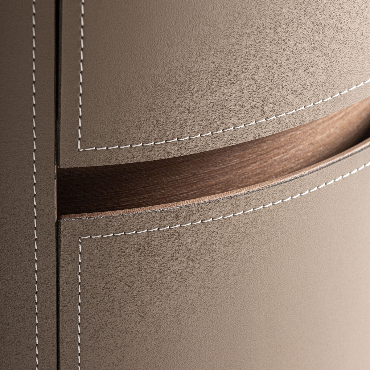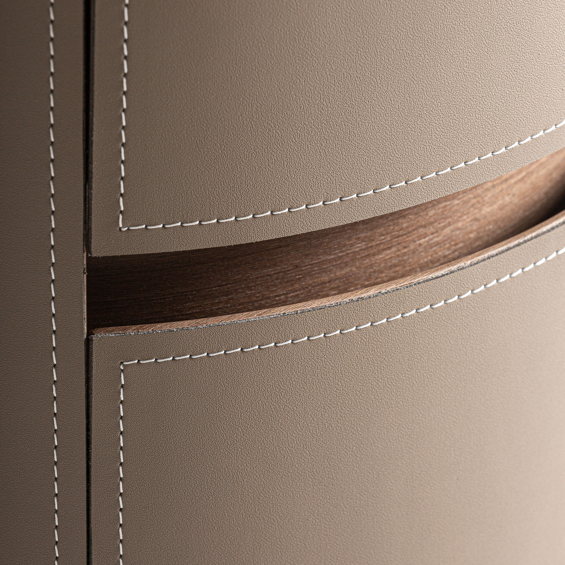 Тумбочка Кандерн, светло-коричневого цвета, стиль арт-деко. Изготовлен из фанеры в сочетании с кожзамом. Ширина: 45 см, Глубина: 45 см, Высота: 48 см.