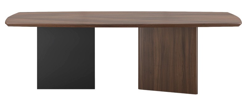 Оригинальный обеденный стол Miramar в современном стиле. Акцентный клиновидный рисунок шпона на столешнице и повторяющая эту же геометрию ножка. Столешница и V-образная ножка из МДФ, отделка — шпон северо-американского ореха. Прямая ножка из металла, черный матовый. Стол фиксированный, на 8-10 человек.