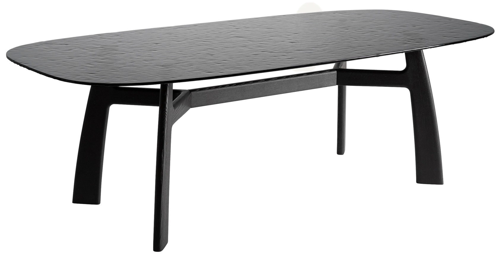 Обеденный стол Suchdol в современном стиле, изготовлен из черного ясеня в сочетании с черным закаленным стеклом. Изделие разборное.