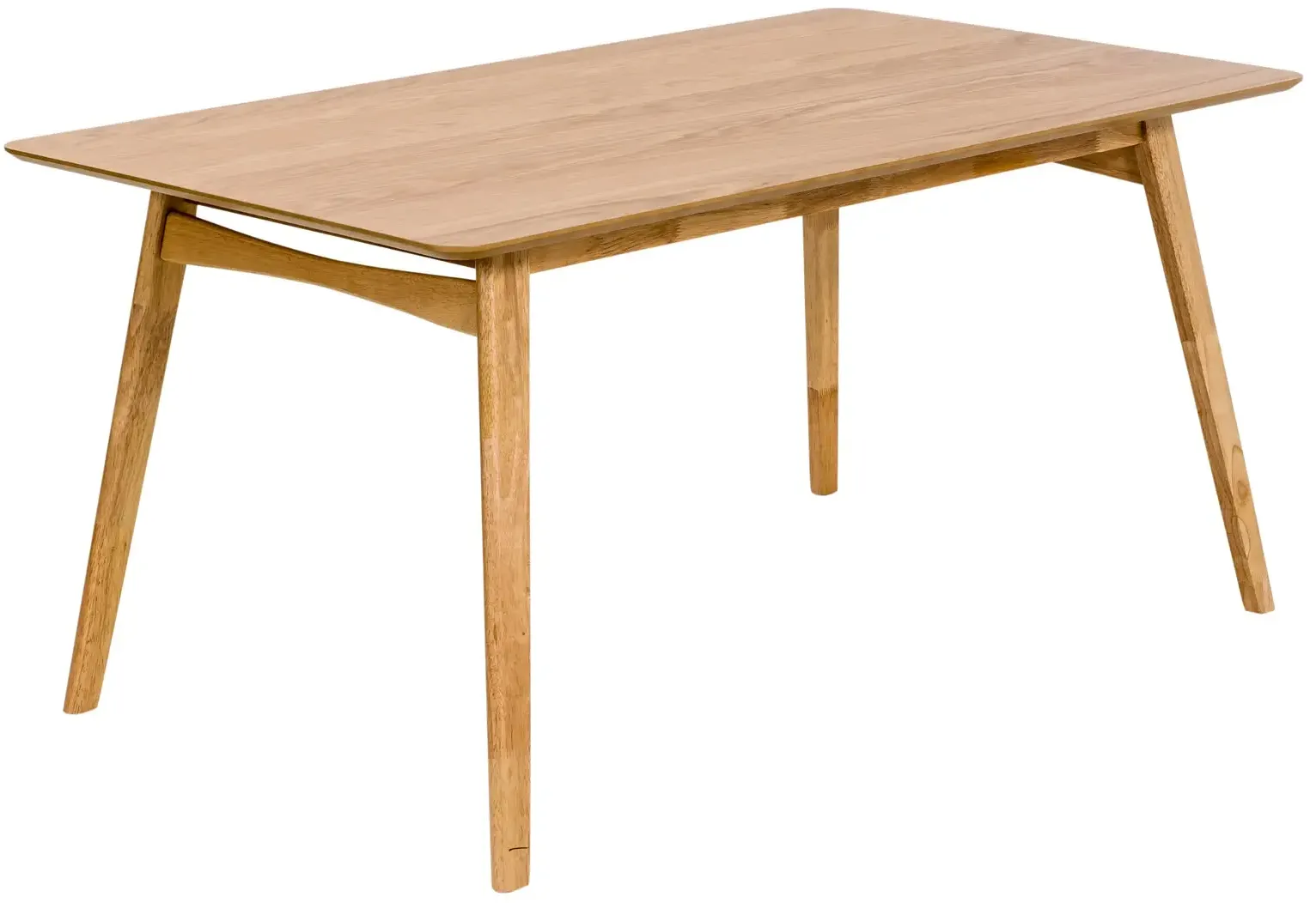 Обеденный стол. Материал столешницы МДФ с дубовым шпоном (цвет натуральный). Ножки изготовлены из цельного каучукового дерева. Толщина столешницы 1,8 см . Длина стола 150 см, ширина 90 см, высота 75 см.