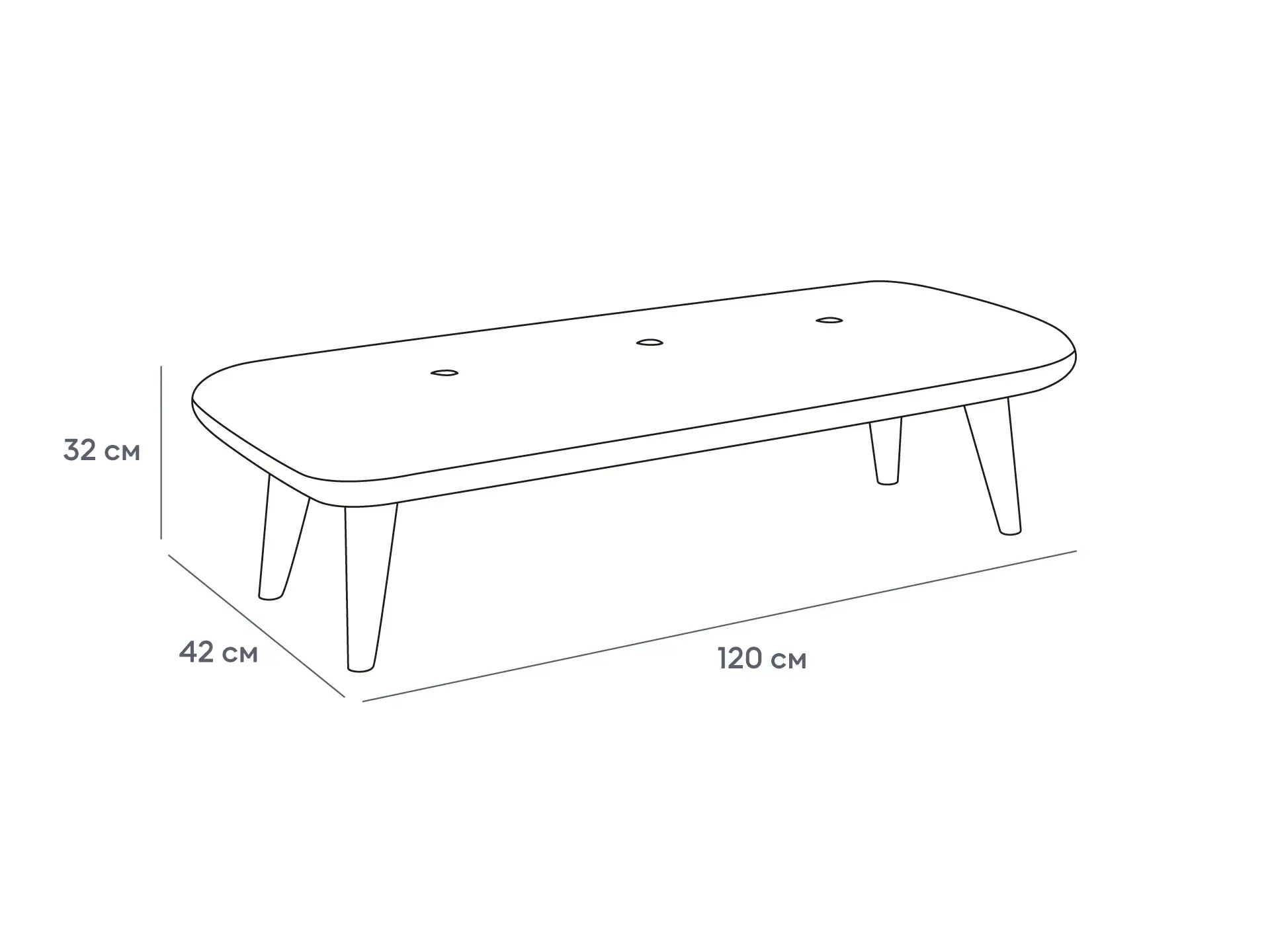 Ширина сиденья – 1200 мм, глубина – 420 мм. Общая высота банкетки вместе с опорами и сиденьем – 320 мм.