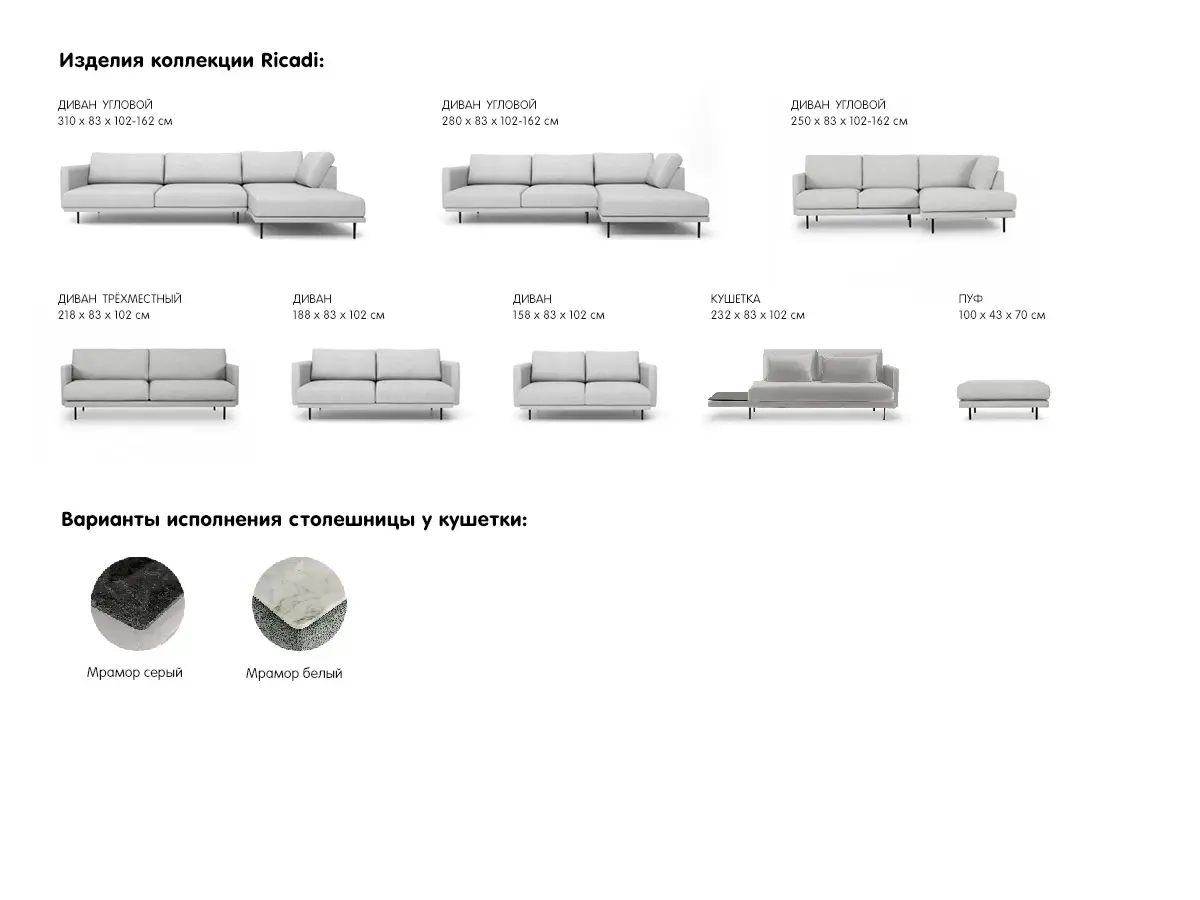 Серия Ricadi обладает сильным характером с простым выражением. Выглядит компактно, но в то же время обрадует просторными и удобными подушками сиденья, комфортным наклоном спинок. В основании изделий — металлические опоры, которые придают «парящее» настроение. За мягкость отвечают специальные слои пенополиуретана Memory Foam: материал легко принимает форму тела, повторяя его контуры и изгибы, создает ощущение невесомости, восстанавливает первоначальный вид. Ricadi — диван, на котором можно потерять счет времени. Современный и практичный — станет естественным выбором для обустройства стильного интерьера. Пуф можно использовать как в паре с диваном в качестве оттоманки, так и в виде персонального сиденья.