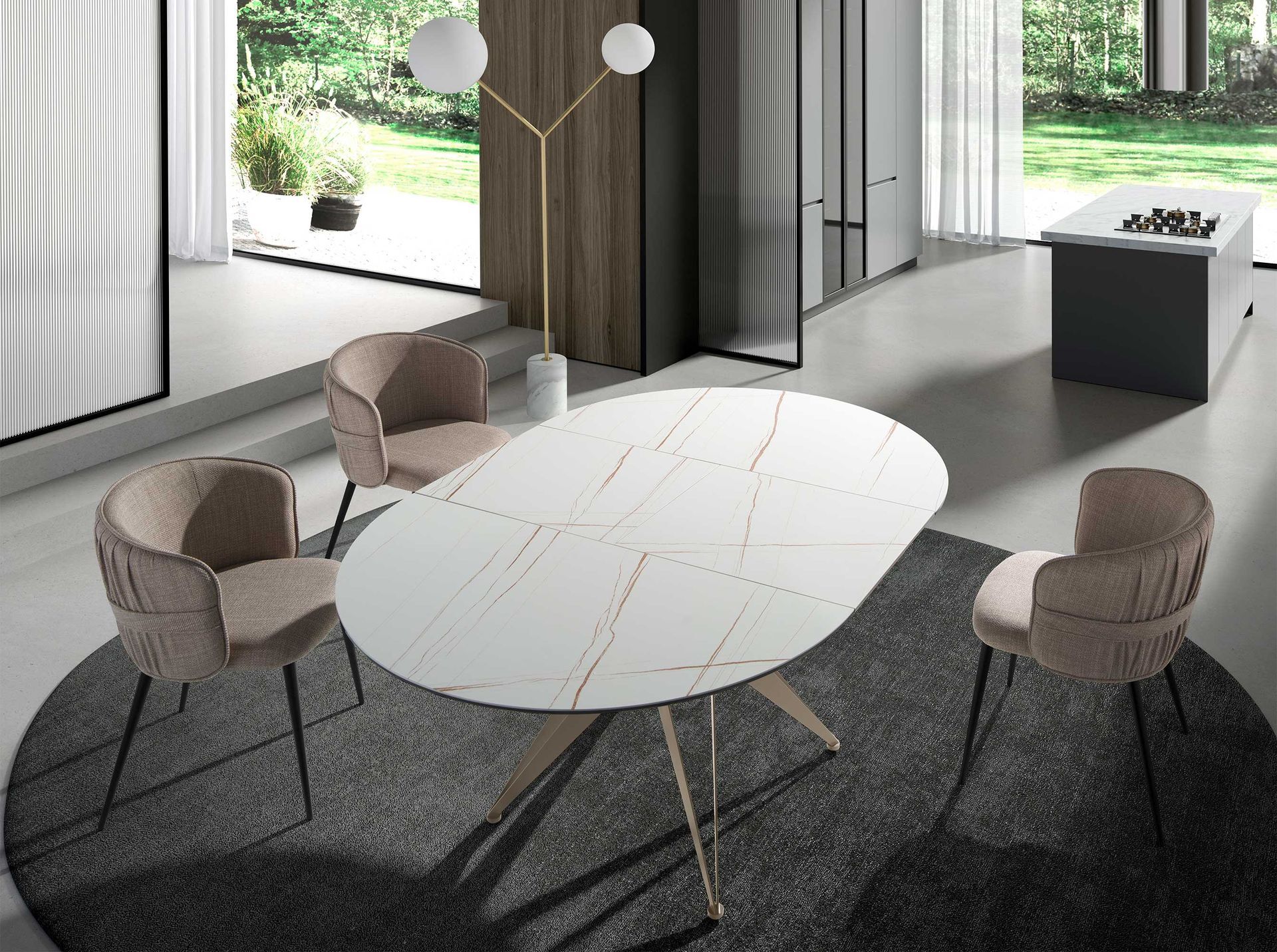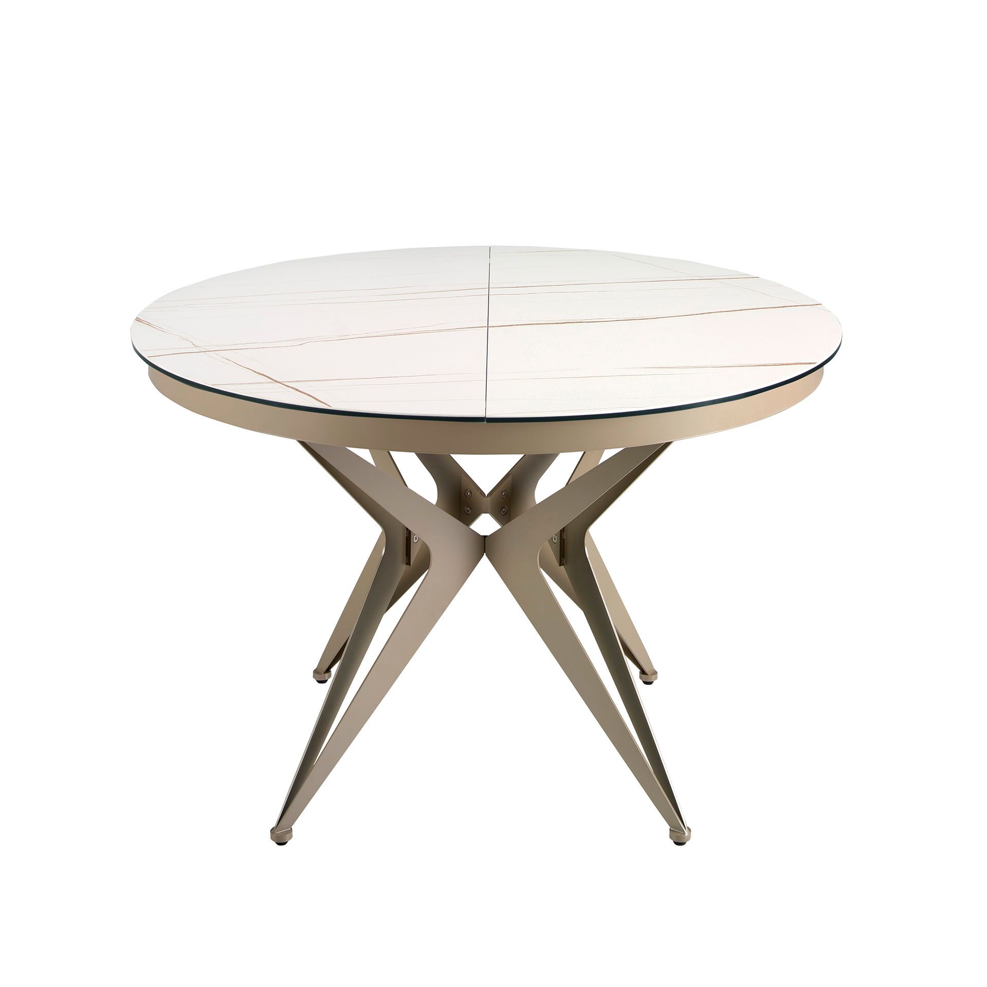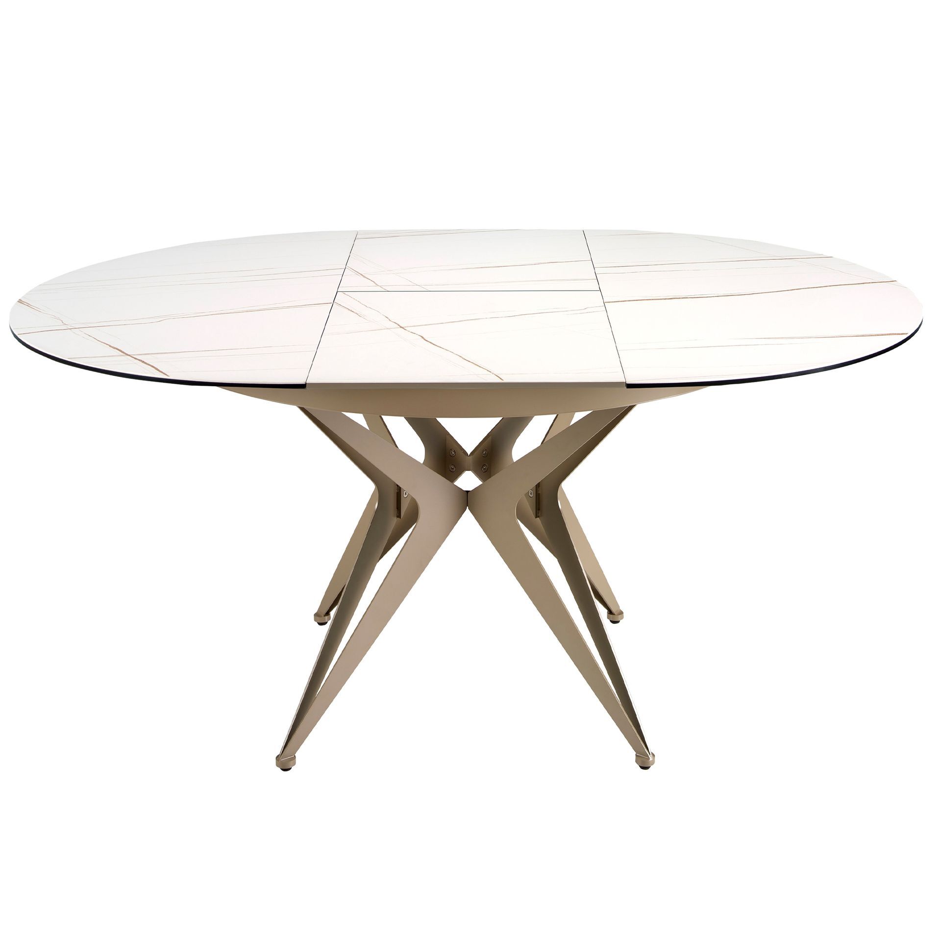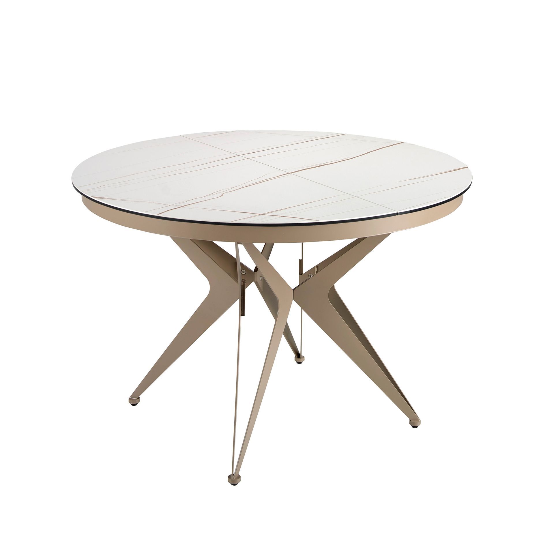 Круглый раздвижной обеденный стол современного дизайна со столешницей из белого фарфорового мрамора с коричневыми прожилками и матовой отделкой. Ножки из нержавеющей стали, окрашенные в цвет шампанского, а также адаптируемость делают его полностью функциональным и универсальным предметом мебели для повседневного использования.