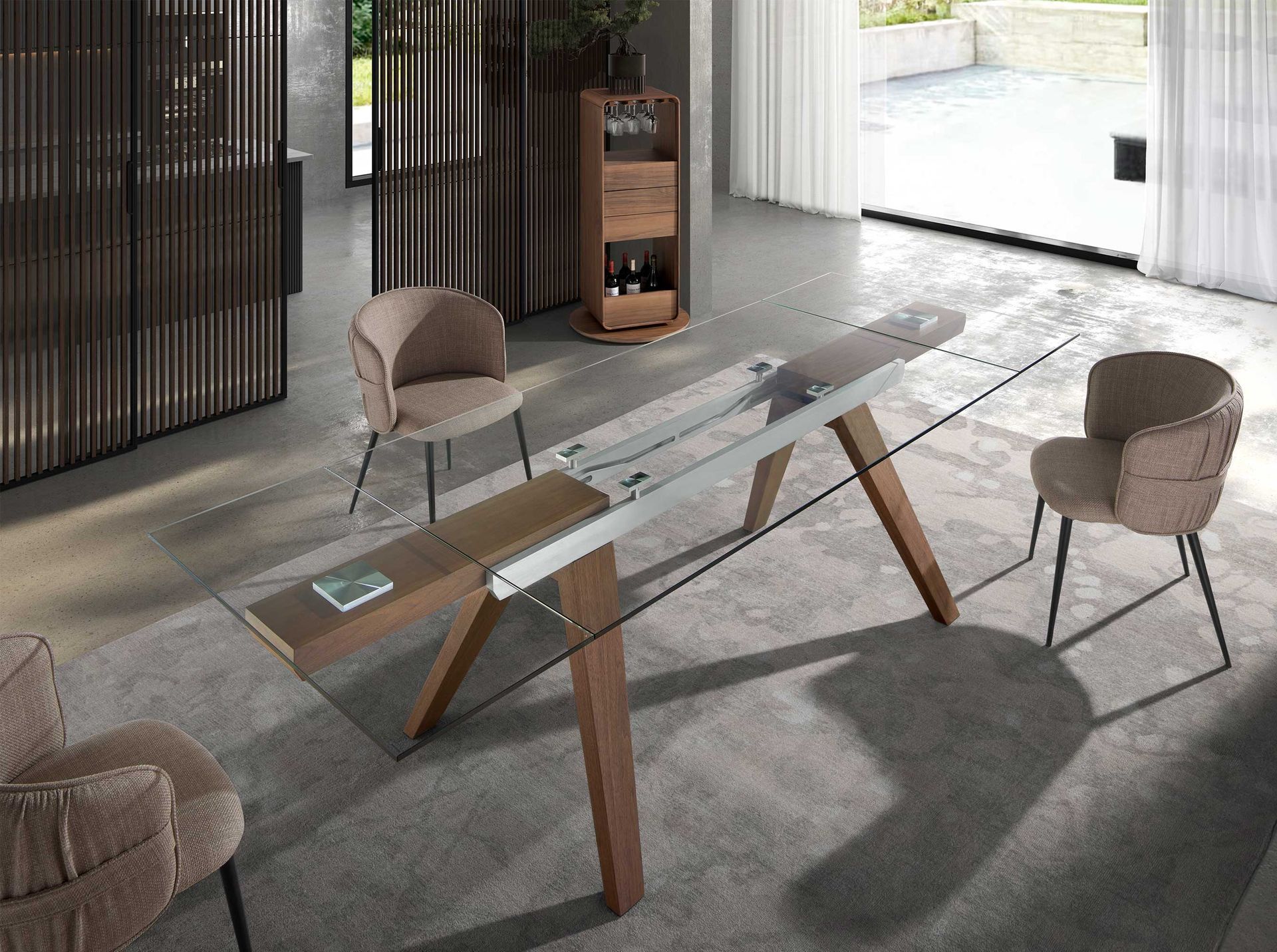 Раздвижной обеденный стол 1131/DT766 от фабрики Angel Cerda – функциональная конструкция в современном дизайне. Раздвижной обеденный стол 1131/DT766 идеально совместим с современным городским дизайном. Его прозрачная столешница в тандеме с деревянными ножками выглядит оригинально и смело. Такой необычный вид сделает вашу столовую индивидуальной. А раздвижная конструкция поможет разместить большую компанию гостей рядом без чувства тесноты. Стол прямоугольной формы, имеет сборную конструкцию. Столешница изготовлена из прозрачного ударопрочного стекла толщиной в 1,5 см. Боковые грани столешницы сглажены. Ножки сделаны из дерева и покрыты сверху шпоном орехового дерева. Они расставлены под углом для улучшения распределения нагрузки. А для защиты напольного покрытия от повреждений предусмотрены специальные накладки. Чтобы увеличить площадь столешницы, необходимо из-под центрального стекла с одной или обеих сторон (по необходимости) выдвинуть дополнительные секции. Они плотно удерживаются на опоре снизу, обеспечивая равномерное распределение нагрузки. Размеры стола: ширина – 180/225/270 см, глубина – 100 см, высота – 76 см. Вес изделия – 134 кг. Потребуется самостоятельная сборка. Инструкция и крепеж включены в комплектацию. Стол предназначен только для эксплуатации в помещении.
