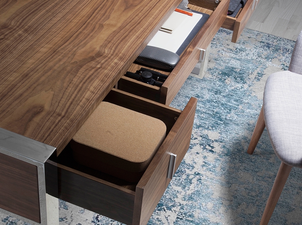 Письменный стол MQ2003 от фабрики Angel Cerda – конструктивный дизайн и превосходство современных материалов. Письменный стол MQ2003 – идеальная модель, чтобы привнести тепло и авангард в ваш офис, кабинет или рабочую зону. Встроенные ящики обеспечат идеальный порядок и станут неотъемлемой частью созданной вами системы хранения. А просторная рабочая площадь позволит не отвлекаться от процесса. Пусть ваше место будет продуманным и стильным! Письменный стол имеет сборную конструкцию. Она состоит из двух мощных рамочных ножек из хромированного металла и толстой столешницы с ящиками. Материал ее изготовления – шпонированный МДФ орехового цвета. Шпон защищен прозрачным лаковым покрытием. Все встроенные ящики оснащены системой плавного закрывания и оригинальными серебристо-серыми ручками, в тон ножкам. Для защиты напольного покрытия от деформации предусмотрены специальные накладки. Размеры стола: ширина – 158 см, высота – 76 см, глубина – 62 см. Вес изделия – 70 кг. Потребуется самостоятельная сборка. Инструкция и крепеж включены в комплектацию.