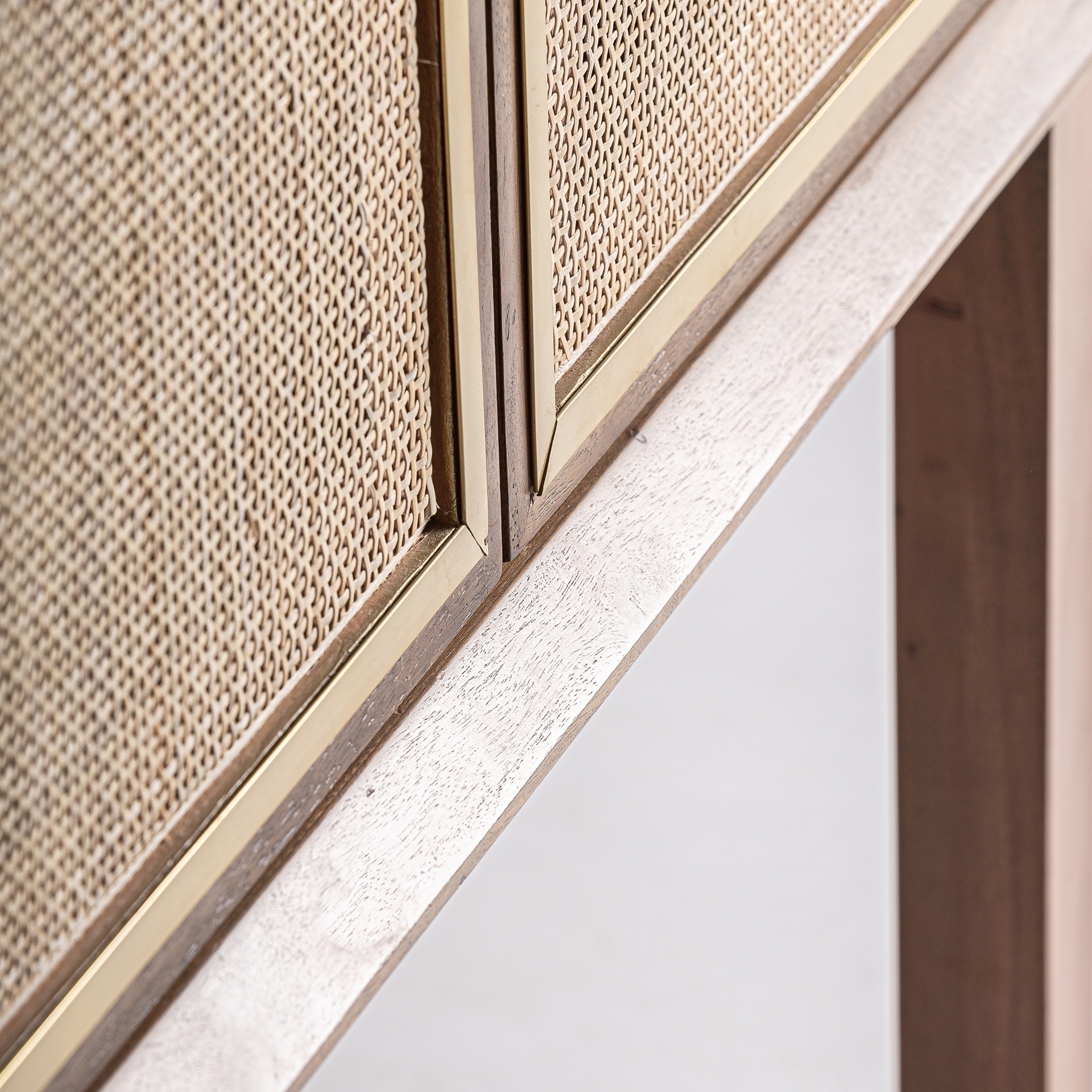 Буфет Gondorf, коричнево-золотой, скандинавский стиль. Изготовлен из древесины манго в сочетании с латунью и ротангом. Съемное изделие.
