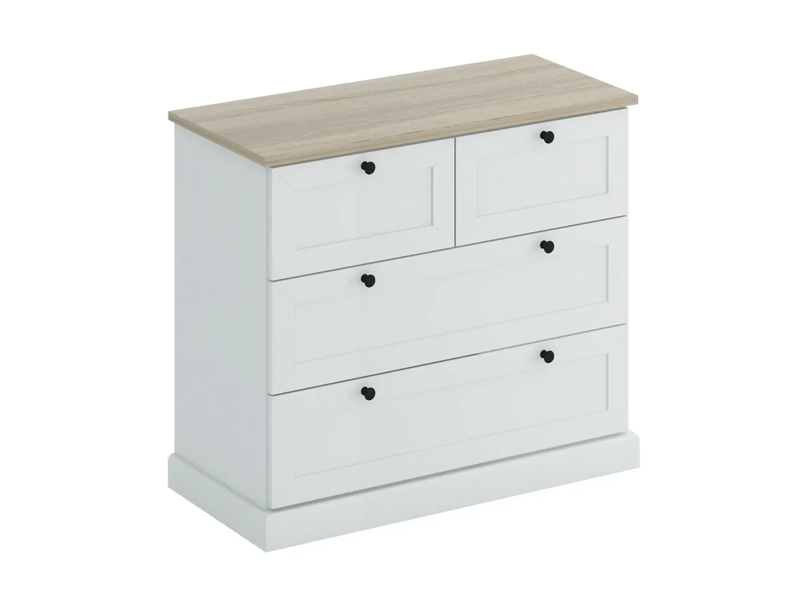 Комод имеет 4 выдвижных ящика, расположенных в трёх горизонтальных рядах.
