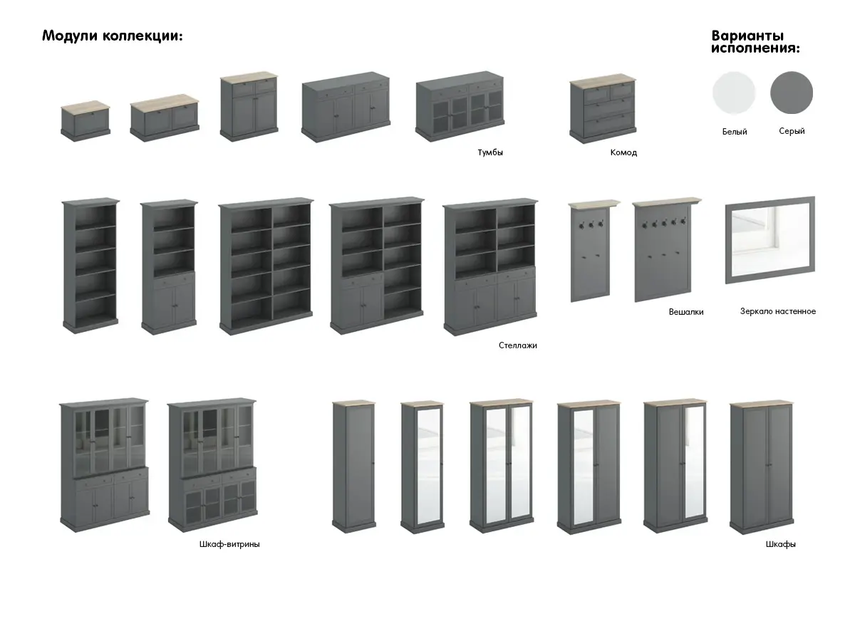 Комбинированные стеллажи с открытыми полками и закрытыми ящиками подходят для документов, техники, косметики, предметов творчества. Открытые стеллажи, удлиненные тумбы можно использовать для зонирования. В шкафу-витрине со стеклянными дверями гармонично будет смотреться как коллекция посуды ручного производства, так и домашняя библиотека. Модели в белом цвете наполнят пространство свежестью, воздушностью, дружелюбной атмосферой. Композиции в сером будут выделяться на светлом фоне, поддержат строгую и сдержанную аранжировку в скандинавской эстетике. Предметы Caprio отличаются продуманным содержанием и сбалансированным внешним видом. Поэтому впишутся как в просторные помещения, так и в компактные интерьеры в стилистике минимализма, сканди, прованса, эклектики.