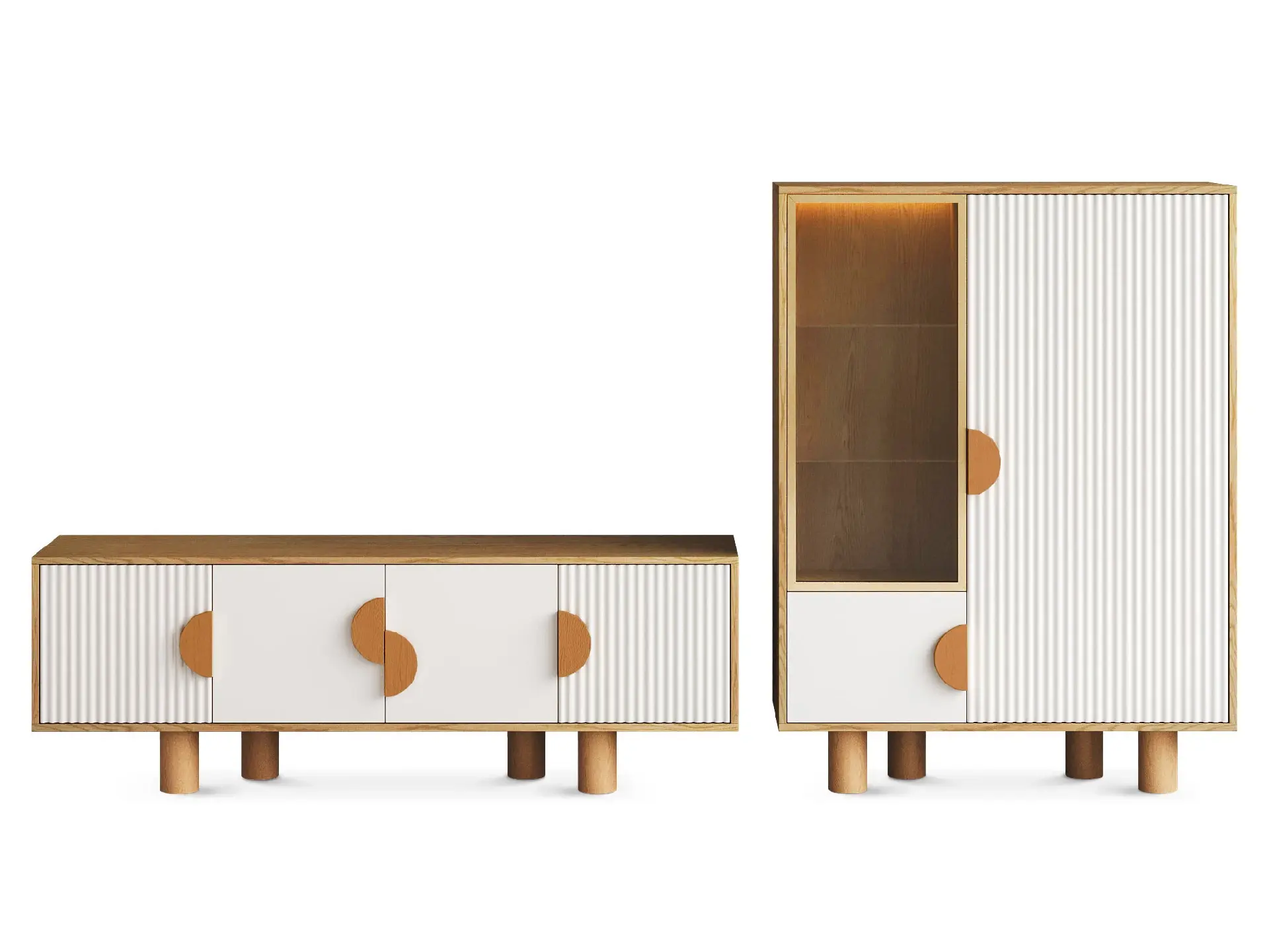 Материал корпуса: МДФ 17 мм. облицованная натуральным шпоном Дуба (крышка, нижний щит, боковые стенки) и ЛДСтП «Белая Шагрень» 16 мм. (внутренние детали корпуса и задняя стенка).