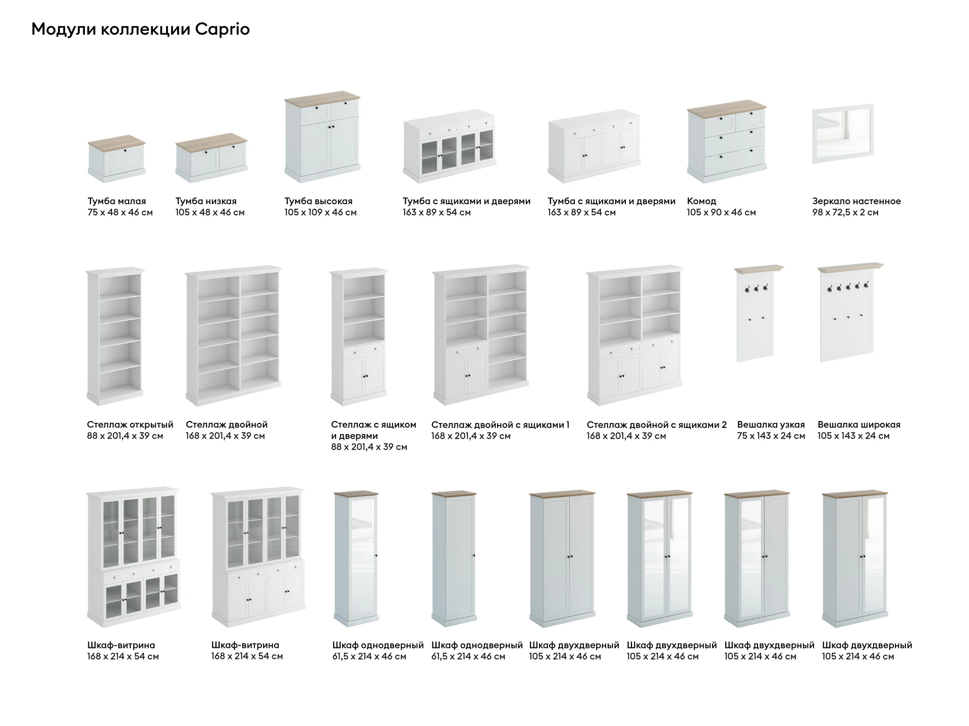 Комбинированные стеллажи с открытыми полками и закрытыми ящиками подходят для документов, техники, косметики, предметов творчества. Открытые стеллажи, удлиненные тумбы можно использовать для зонирования. В шкафу-витрине со стеклянными дверями гармонично будет смотреться как коллекция посуды ручного производства, так и домашняя библиотека. Модели в белом цвете наполнят пространство свежестью, воздушностью, дружелюбной атмосферой. Композиции в сером будут выделяться на светлом фоне, поддержат строгую и сдержанную аранжировку в скандинавской эстетике. Предметы Caprio отличаются продуманным содержанием и сбалансированным внешним видом. Поэтому впишутся как в просторные помещения, так и в компактные интерьеры в стилистике минимализма, сканди, прованса, эклектики.